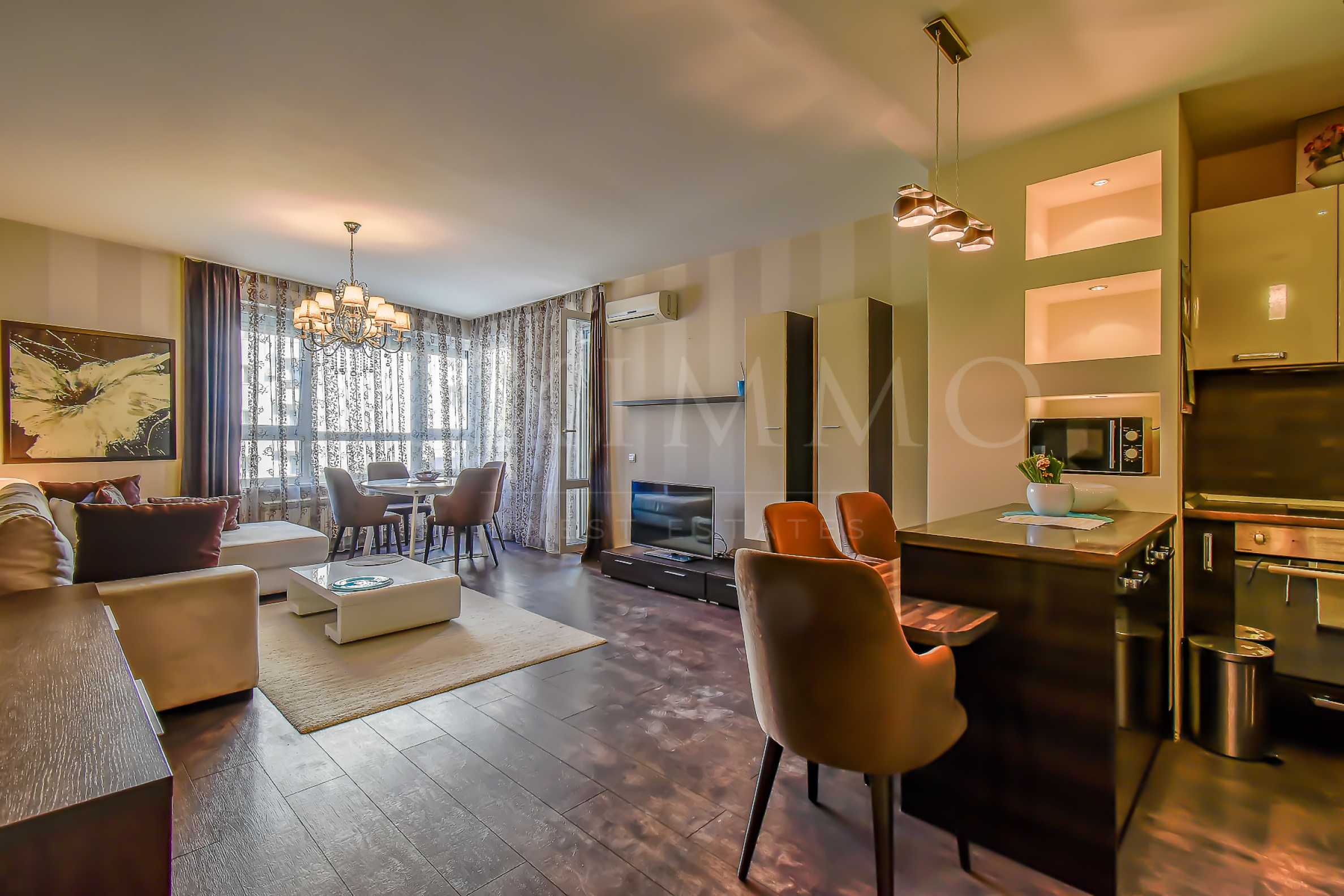 Апартаментът се състои от входно антре, просторна дневна зона с кухненски бокс, оборудван с висок клас електроуреди, трапезария с елегантна маса и столове, както и комфортен кът за отдих с мека мебел и телевизор. В отделно помещение е обособен дрешник с пералня и сушилня, осигуряващ практично решение за ежедневието. Спалните помещения са две — родителска спалня с уютна атмосфера и втора стая, която може да се използва като детска или работен кабинет, оборудвана с удобно бюро.