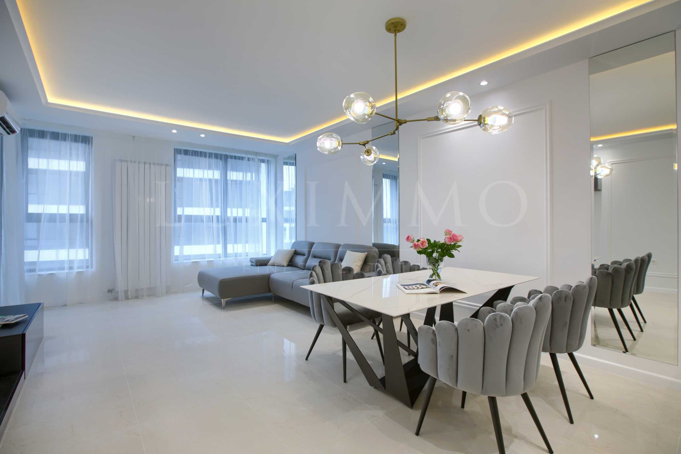 Апартаментът е обзаведен с много внимание към всеки детайл. Интериорът дизайнерски, в комбинация от бели и сиви цветове, с чисто ново модерно обзавеждане, висок клас оборудване и ефектно осветление. Много светлина и уют ще Ви посрещнат от всяко едно помещение.