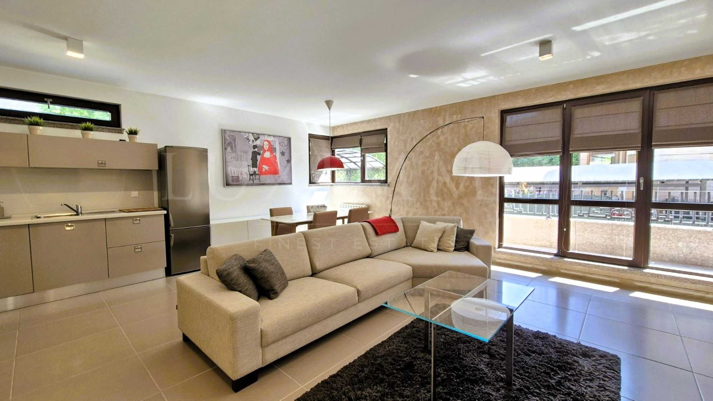 Просторен и качествен, имотът е завършен с всичко необходимо за едно комфортно ежедневие на бъдещите наематели. Състои се от входно антре, дневна с трапезария и кухненски бокс с излаз към голяма тераса, коридор, две спални, тоалетна за гости, една баня с тоалетна и мокро помещение. Имотът е с цялостно италианско обзавеждане. Кухня Lube с висок клас електроуреди, уютна трапезария и комфортна мека мебел в хола. Блиндирана външна врата "Диере''. Отоплението е разрешено посредством индивидуална отоплителна система с радиатори и котле на газ.