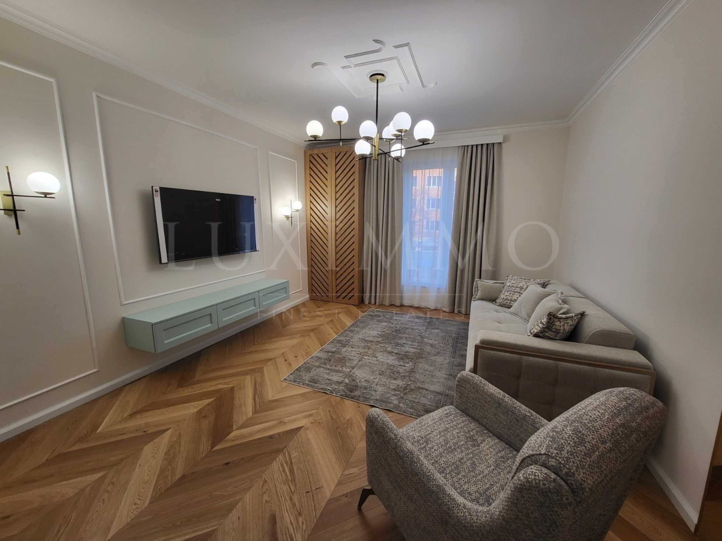 Интериорните решения са дизайнерски, с елегантни, нови мебели и довършителни работи от най-висок клас. Светли и просторни помещения, с високи тавани, подови настилки от естествен паркет и гранитогрес, и висок клас PVC дограма. Кухнята е напълно оборудвана с кухненски плот от технически камък, хладилник, фурна със стъклокерамични котлони, абсорбатор, съдомиялна машина, комбинирана пералня със сушилня.