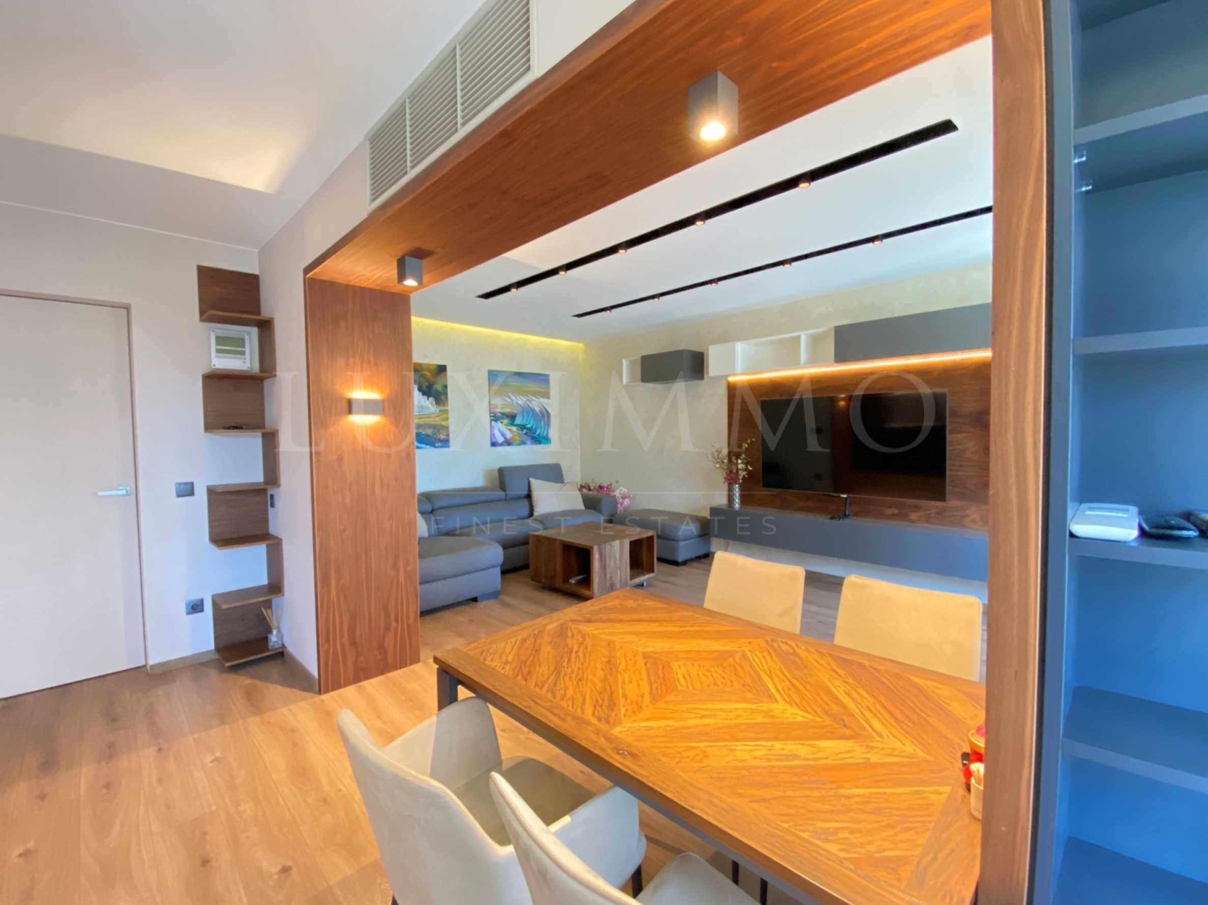 Апартаментът е ситуиран на 5-и етаж в 7-етажна сграда и се радва на много светлина, уютна атмосфера и гледки към града. Със своите 90 кв.м чиста площ, разполага с просторен хол с висок клас оборудвана кухня, две спални, коридор с луксозни тапетни врати, баня с тоалетна и мокро помещение с пералня и сушилня Bosch. Кухнята е оборудвана с електроуреди Bosch, котлон AEG с водоравно вграждане, хладилник с ледогенератор Liebherr и миялна машина Bosch.