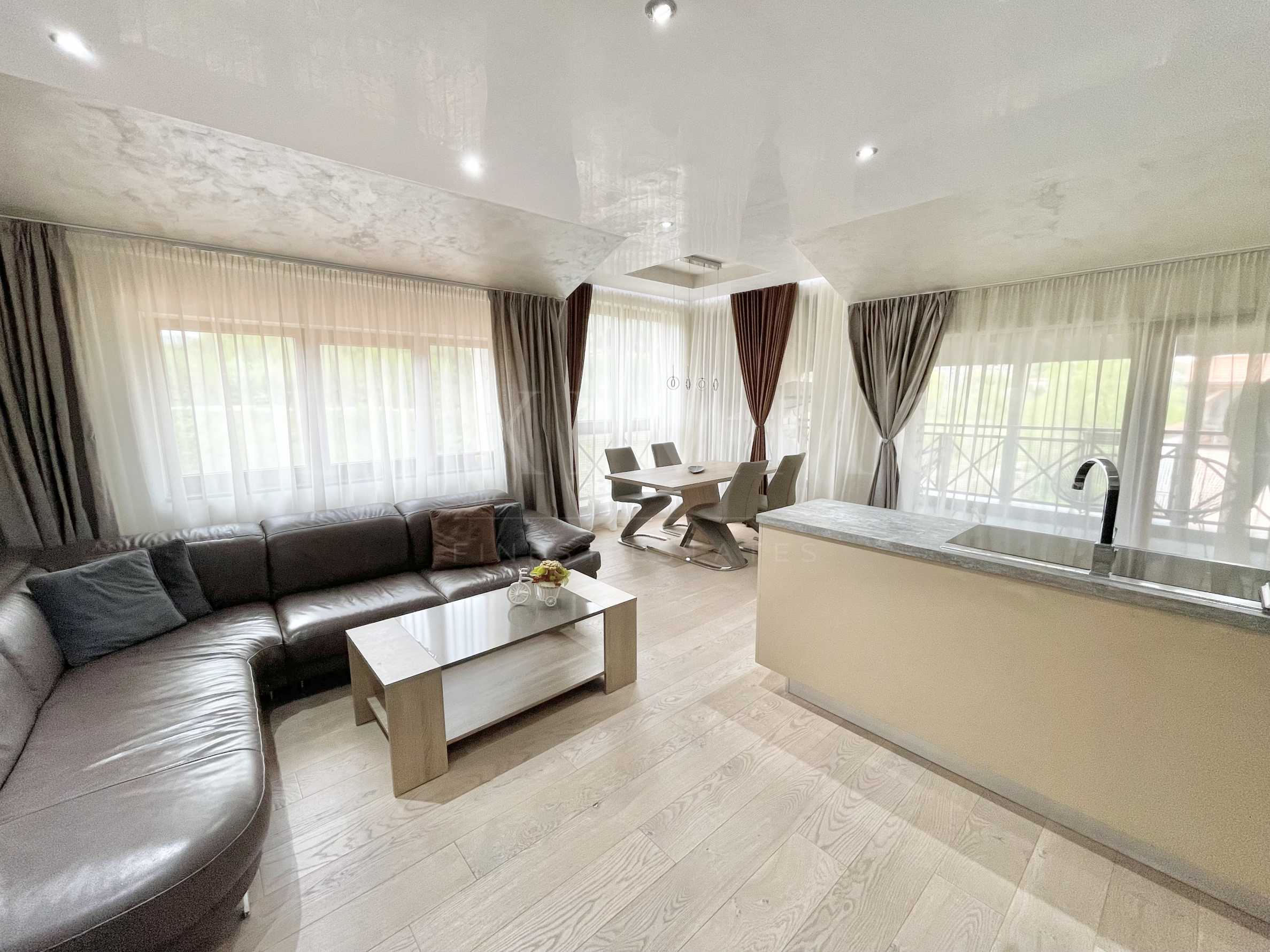 Апартаментът е напълно обзаведен и готов за живеене, предлага се с цялото налично обзавеждане. Изложението е запад/север/юг с прекрасна панорамна гледка.
