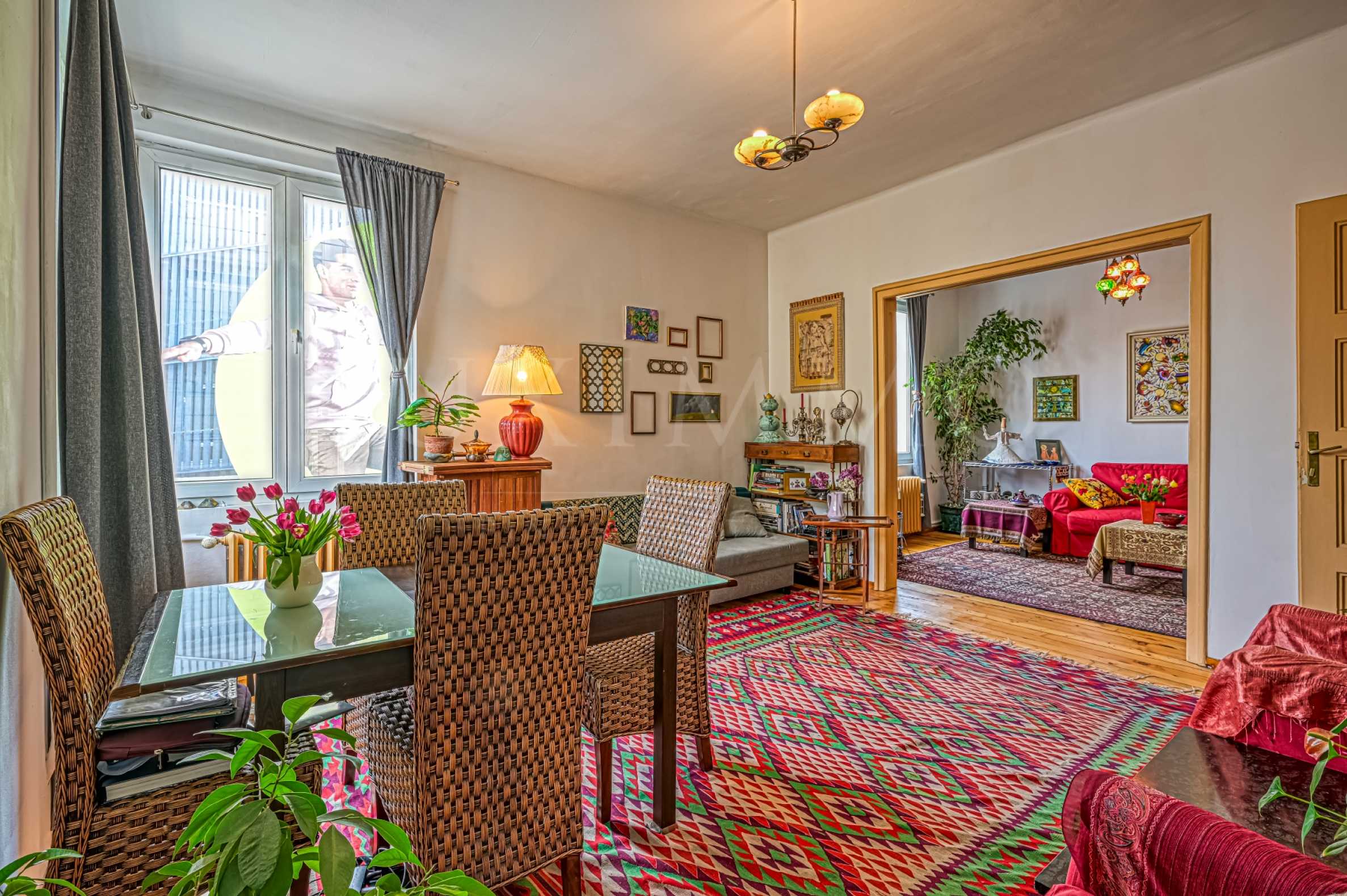 На жилищна площ от 112 кв.м са разпределени малка кухня, трапезария, хол, две спални, вестибюл, тераса и баня със санитарен възел. Кухнята и трапезарията са с изглед към улицата, а двете спални и хола гледат към двора на сградата, където може да насладите на абсолютна тишина и спокойствие. Аристократично жилище, което дава усещане за свобода с високи тавани, просторни помещения и зашеметяващи гледки.