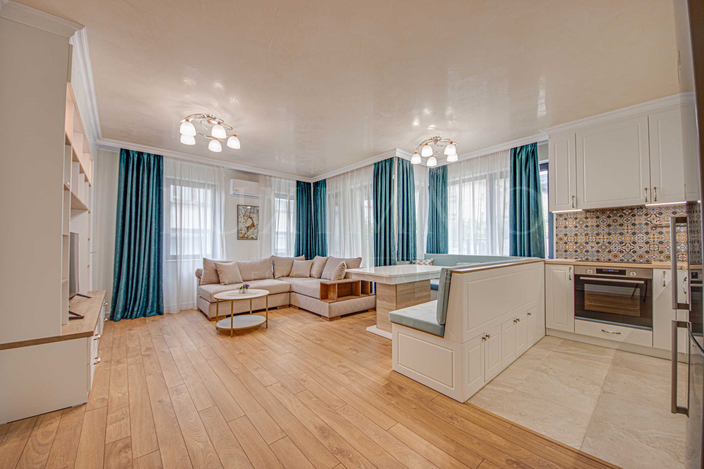 Всекидневната е просторна и светла, обзаведена в топли цветови тонове, с комфортна мека мебел, елегантен кухненски бокс, зона за релакс и тераса с гледка към планината. Кухнята е оборудвана с висок клас, нова техника. Родителската спалня е със собсвена баня с прозорец, дрешник и тераса с красива гледка.