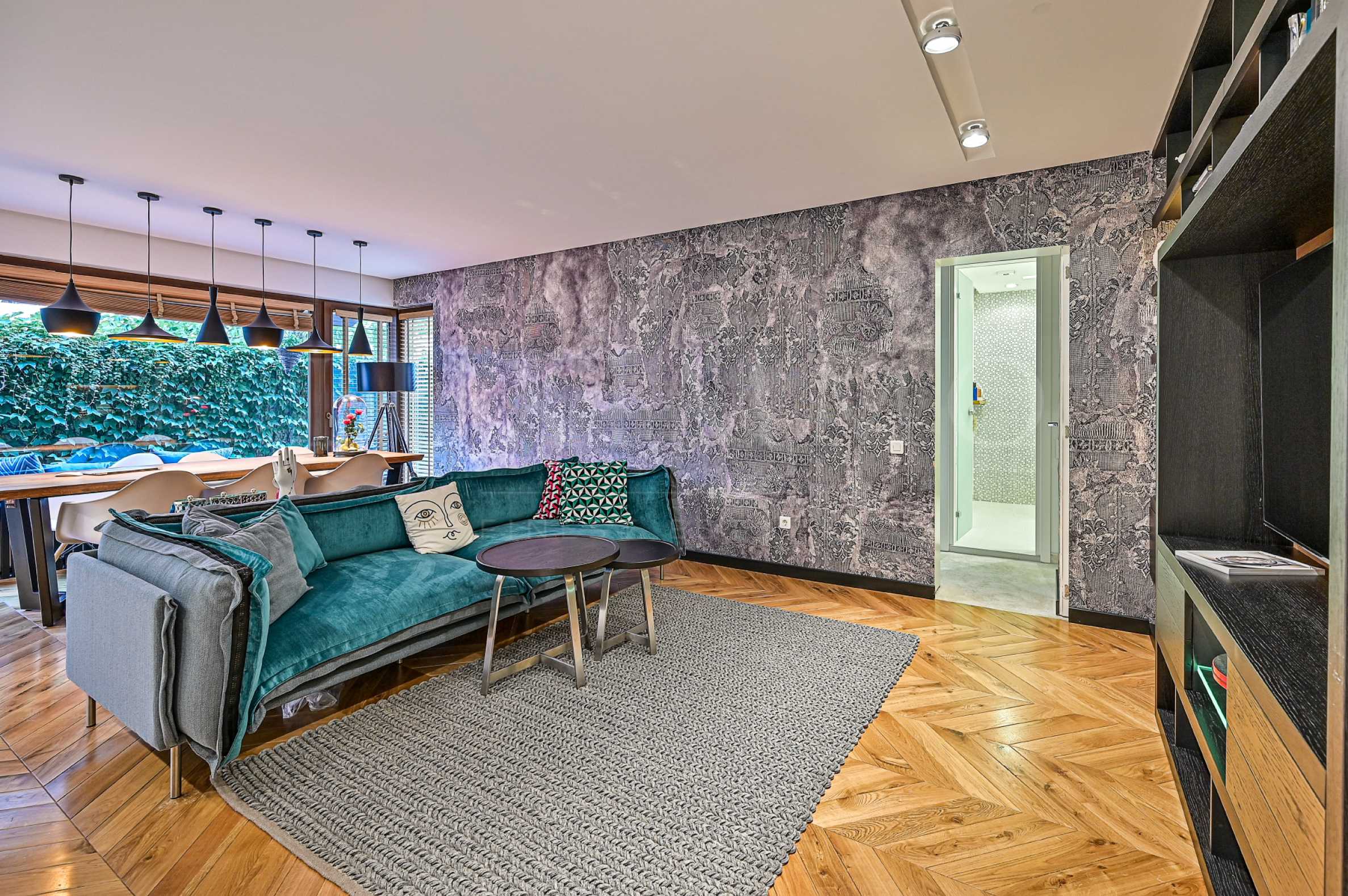 Жилището предлага просторни и светли помещения, и атрактивен интериор, завършен с внимание към детайла, създаващ уютна атмосфера за живот. На разположение е напълно оборудвана кухня с фурна и котлони Siemens, хладилник AEG, абсорбатор Faber, пералня със сушилня AEG и телевизор Sony във всекидневната. Дворът е приятно озеленен и разполага с отлична зона за релакс, оборудвана с комфортна мека мебел. Отоплението е на газ.