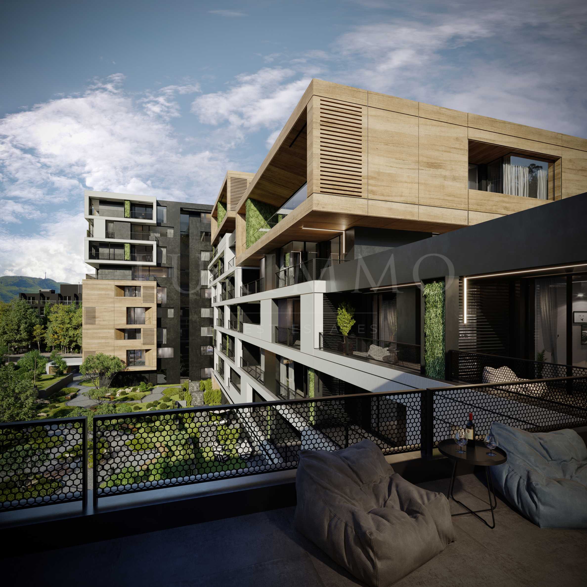 Търсената игра в пластиката на изпъкващи и потъващи обеми от стъкло в общата фасада е съчетана с мотив от вертикални зелени стени, естетически криещи климатични тела. Всички тераси, включително и тези на последния етаж, са решени като покрити с оглед на ослънчаването. Настилката на терасите е тип двоен под от плочи от гранитогрес. Ажурните парапети са изпълнени в два варианта – стъклени триплекс или с метална рамка с мрежа expanded metal в цвят черно по архитектурен детайл, следващи композиционната идея. Допълнителната композиция от фасадното линейно LED осветление е целенасочено търсена, за да подчертае основната идея и през нощта. Идеята на динамичната композиция е продължена в проекта за озеленяване на основния двор на комплекса в комбинация с габиони, парково обзавеждане и осветление и водна площ.