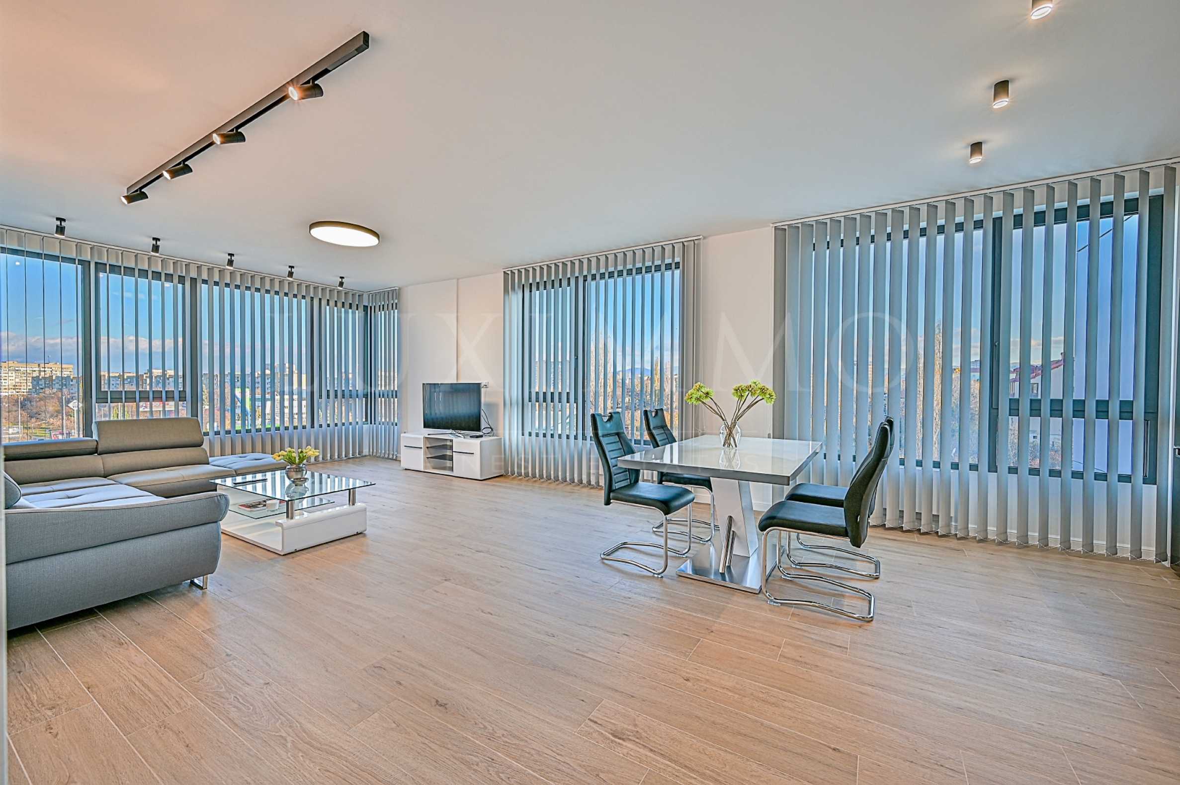 Имотът се състои от просторна и светла дневна /46 кв. м/ с кухня, две спални, баня, дрешник, складово помещение, коридор и тераса. Просторната дневна зона е обзаведена с кът за сядане, маса за хранене с 4 стола, луксозни вертикални щори. Апартаментът е с обзаведена спалня и системи за съхранение в дрешника.