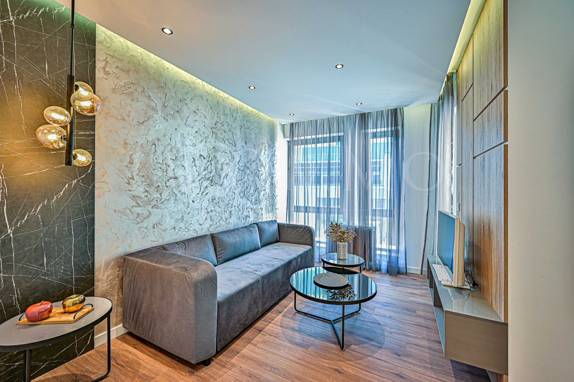 Жилището е изпълнено по дизайнерски проект и се предлага завършен с висок клас довършителни работи и обзавеждане, както е представен на снимките. Отоплителната система е изградена - с газов котел Viessmann, климатици Daikin и монтирани радиатори. Кухнята е напълно оборудвана с всички необходими електроуреди. Изложение - хол - запад, спални - изток.