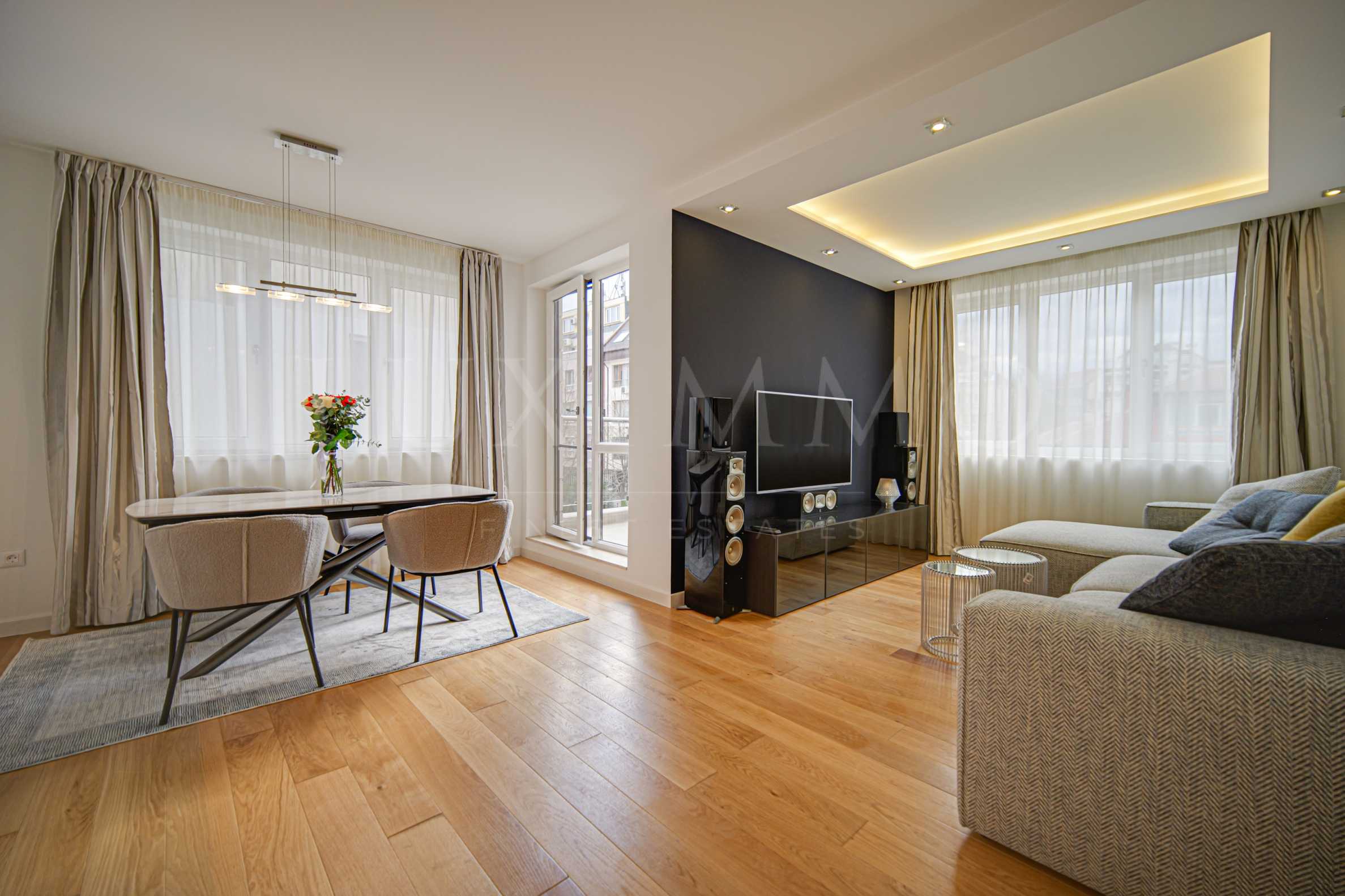 Жилището е изключително уютно, завършено с интериор в светли тонове, с комфортни мебели и качествена техника. Подовите настилки във всекидневната и по-голямата спалня са от естествен паркет. Кухнята е снабдена с всичко необходимо за едно домакинство - пералня със сушилня Bosch, миялна машина Bosch, no-frost хладилник с фризер Bosch, фурна и котлони Gorenje, както и микровълнова печка и кафемашина. Втората спалня е с голям стъклен гардероб, като може да се ползва като гостна, офис или детска стая, според нуждите на новите наематели. В банята е вграден Touch Screen Music Player с радио и Bluetooth озвучение, вградено в тавана. В хола ще намерите 55" smart TV Philips, както и Home cinema 5+1 на Yamaha.