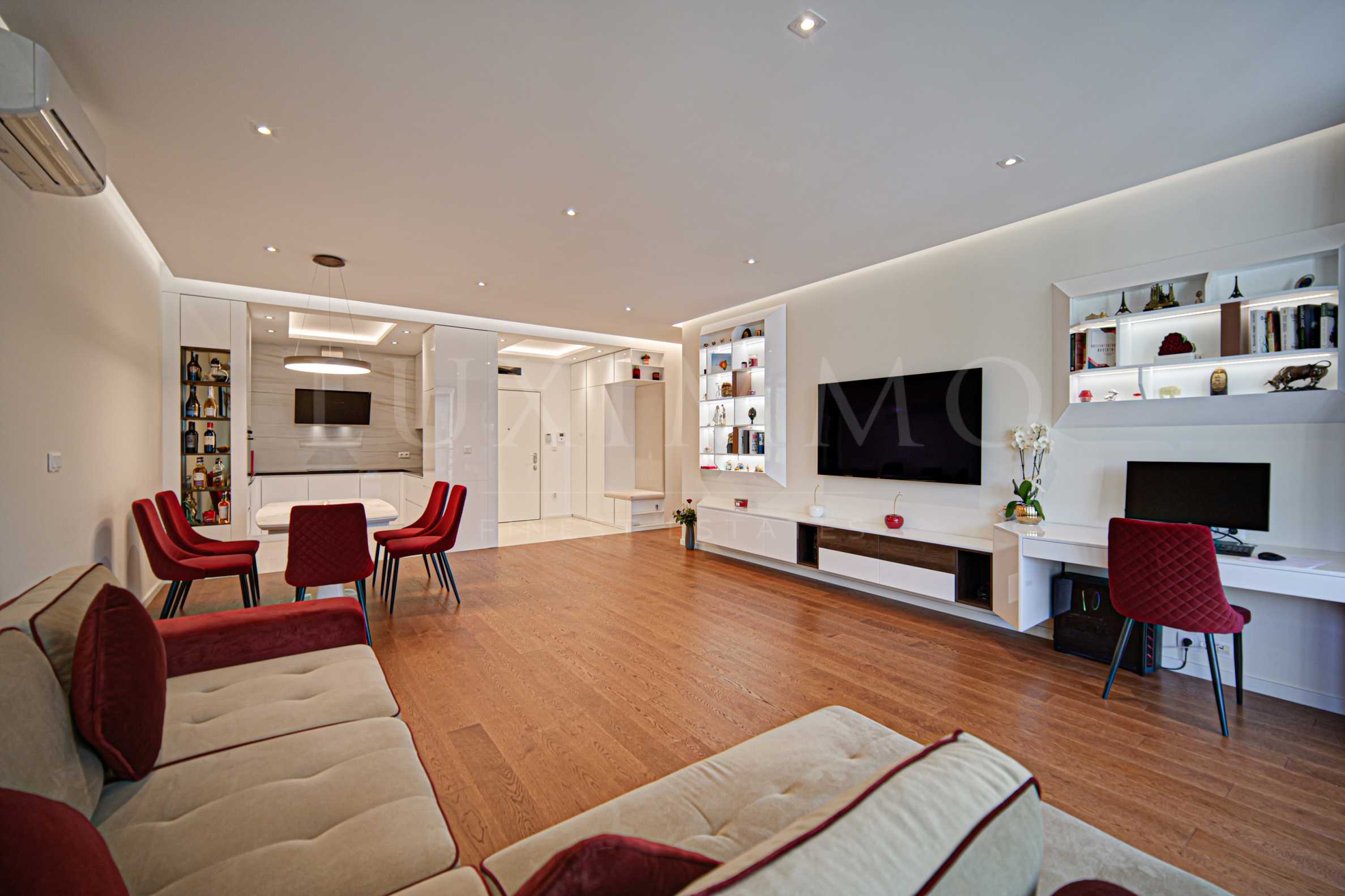 Интериорът е заършен по индивидуален проект на водещо дизайнерско студио, балансиращ между визия и функционалност с висок клас техника, материали и мебели.