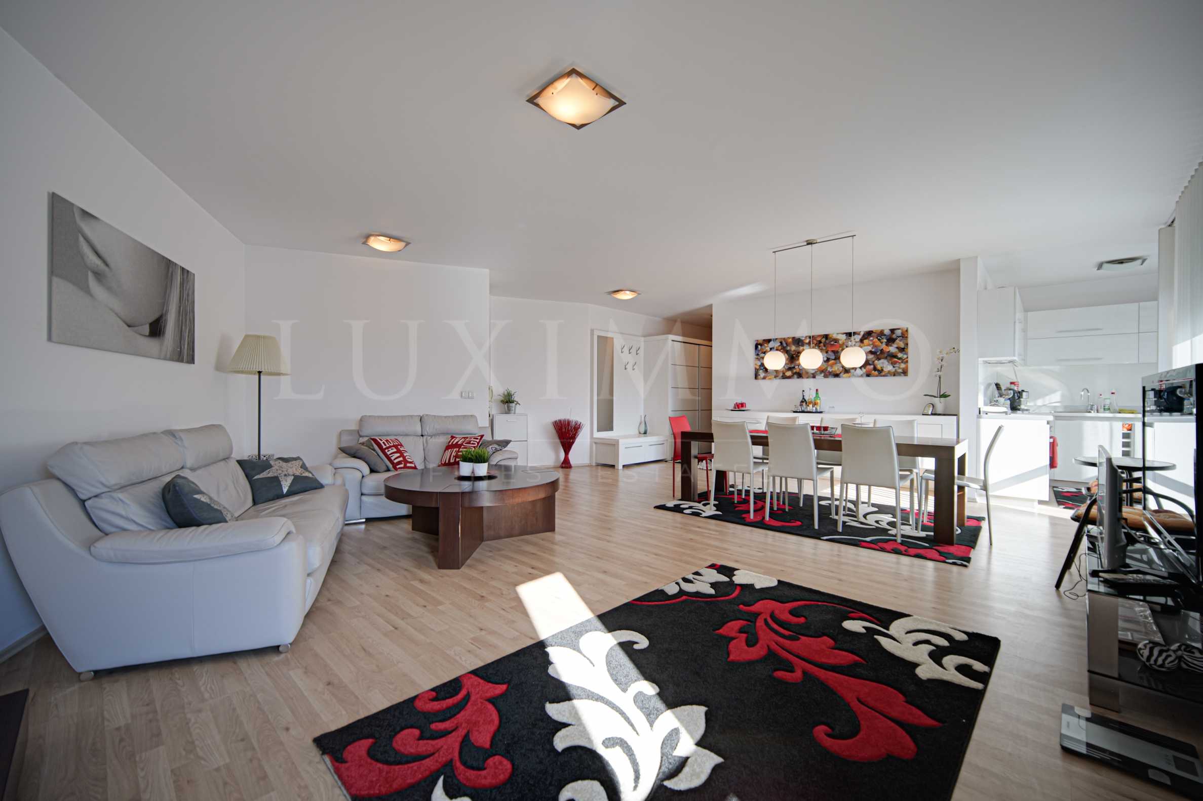 Жилището разполага със 130 кв.м обща площ, която е разпределена между антре, всекидневна с кухненска част, родителска спалня, втора спалня, баня с тоалетна, тоалетна за гости, две тераси.