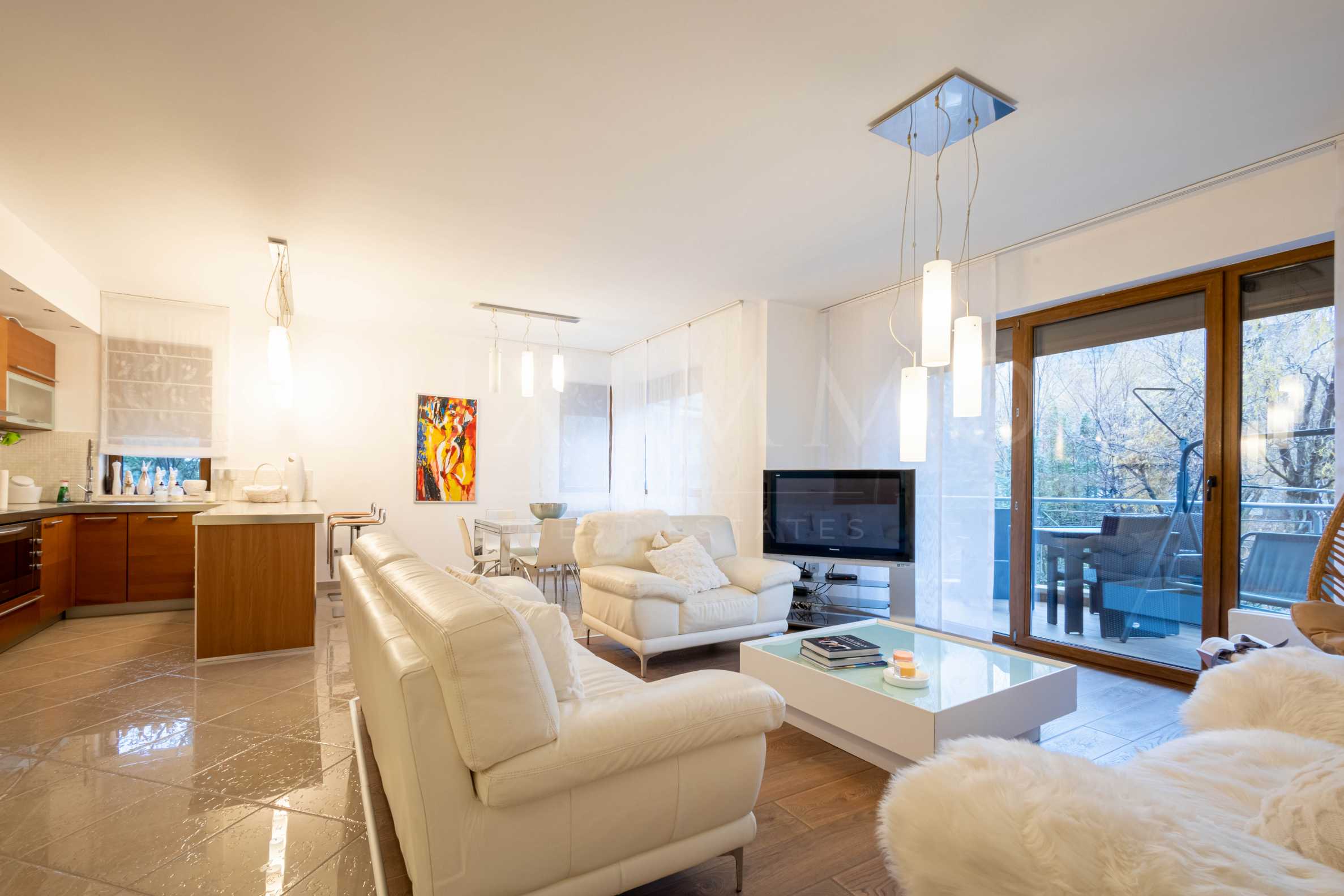 Настилките на пода в апартамента са гранитогресни плочи Мараци и естествен паркет Tehnowood, от най-високо качество.