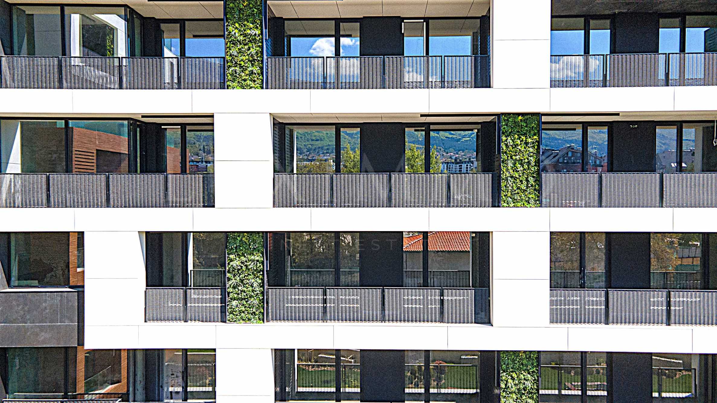 Търсената игра в пластиката на изпъкващи и потъващи обеми от стъкло в общата фасада е съчетана с мотив от вертикални зелени стени, естетически криещи климатични тела. Всички тераси, включително и тези на последния етаж, са решени като покрити с оглед на ослънчаването. Настилката на терасите е тип двоен под от плочи от гранитогрес. Ажурните парапети са изпълнени в два варианта – стъклени триплекс или с метална рамка с мрежа expanded metal в цвят черно по архитектурен детайл, следващи композиционната идея. Допълнителната композиция от фасадното линейно LED осветление е целенасочено търсена, за да подчертае основната идея и през нощта. Идеята на динамичната композиция е продължена в проекта за озеленяване на основния двор на комплекса в комбинация с габиони, парково обзавеждане и осветление и водна площ.