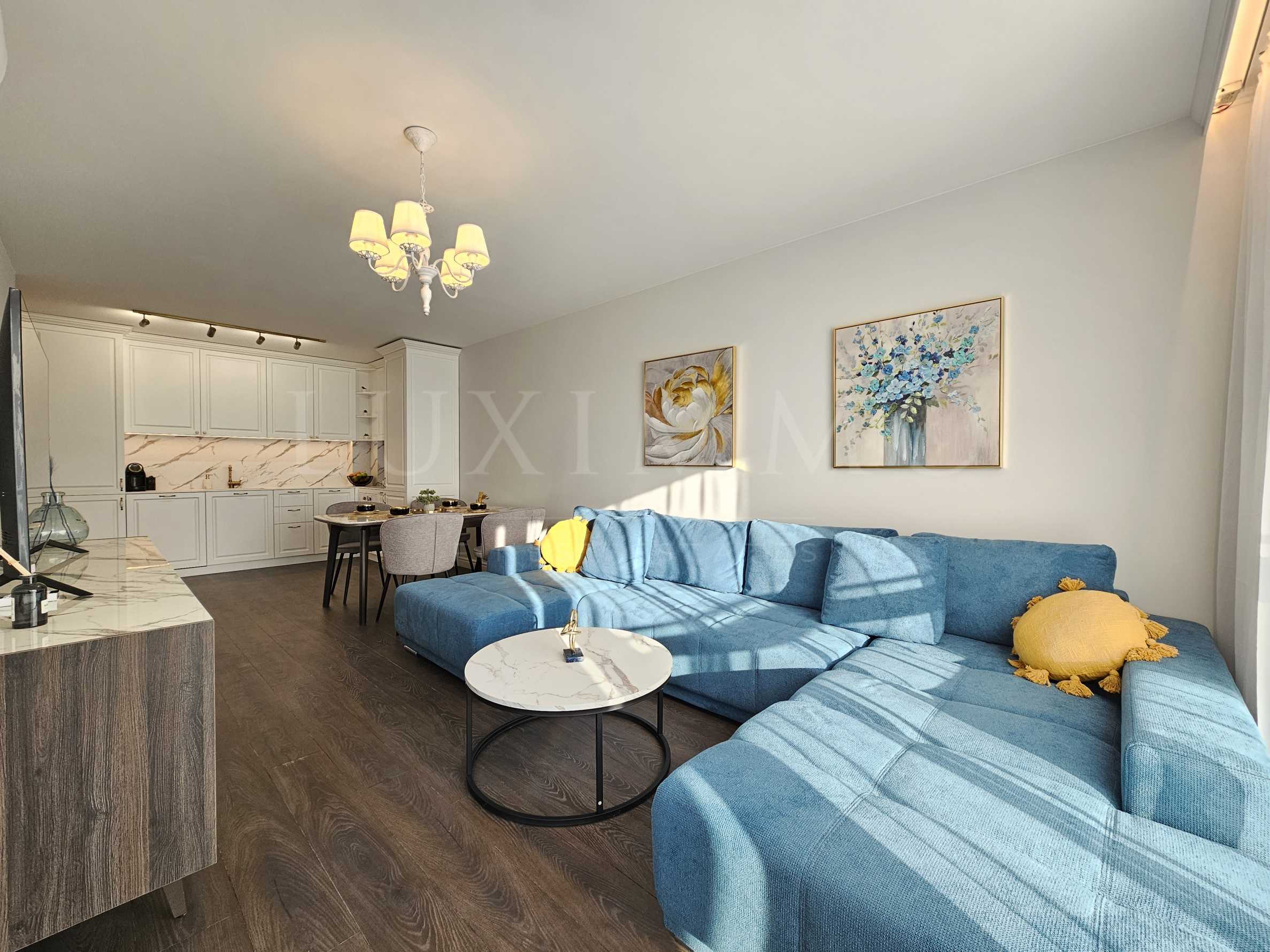 Обзавеждането на апартамента е от висок клас, предоставяйки елегантност и функционалност, включва продукти от известните марки Miele и Bosch, които гарантират качество и дълготрайност.