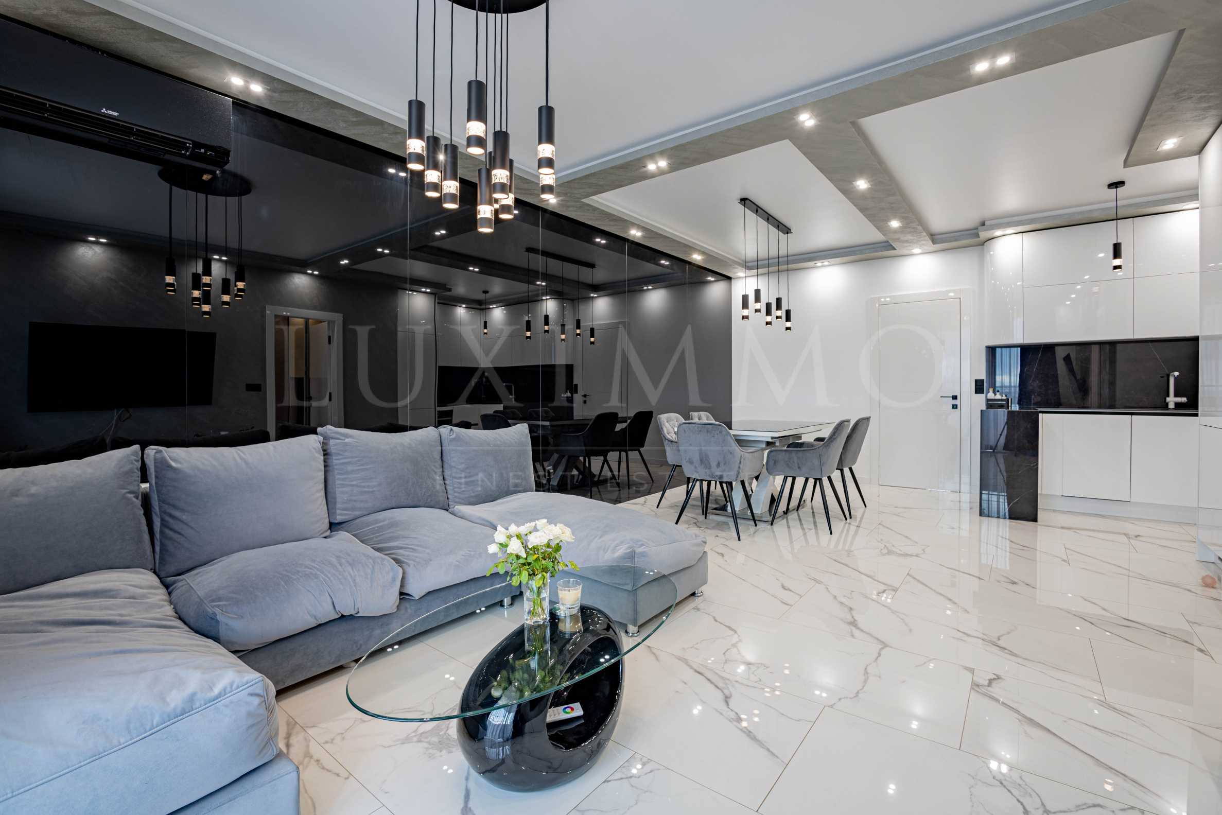 Жилището се предлага напълно обзаведено и оборудвано с модерни мебели. Кухнята е по индивидуална поръчка и е оборудвана с висококачествена техника на марката BOSCH/фурна, котлони, миялна машина, хладилник, аспиратор FABER, които са с актуална гаранция.