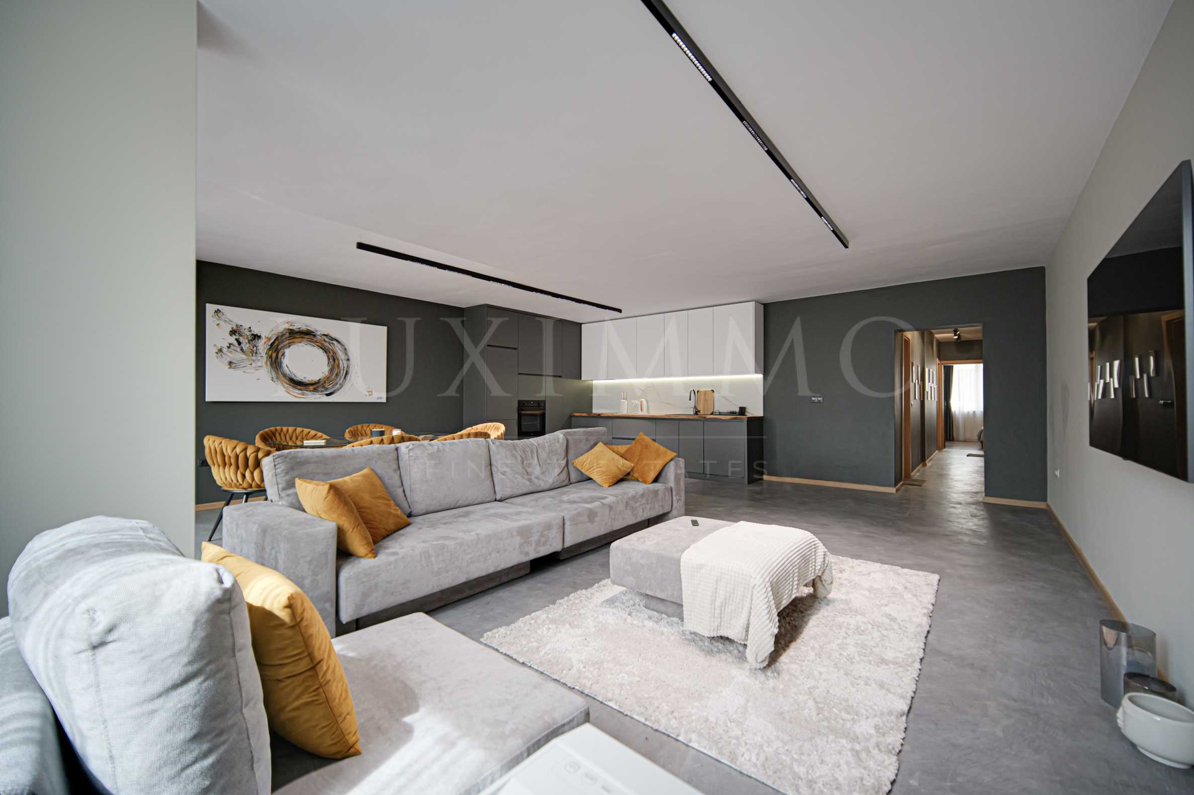 Апартаментът е изпълнен по индивидуален проект с висок клас обзавеждане и оборудване, предлага атрактивен, артистичен дизайн в сиви и земни тонове, с отлично зонирано пространство и модерен уют.