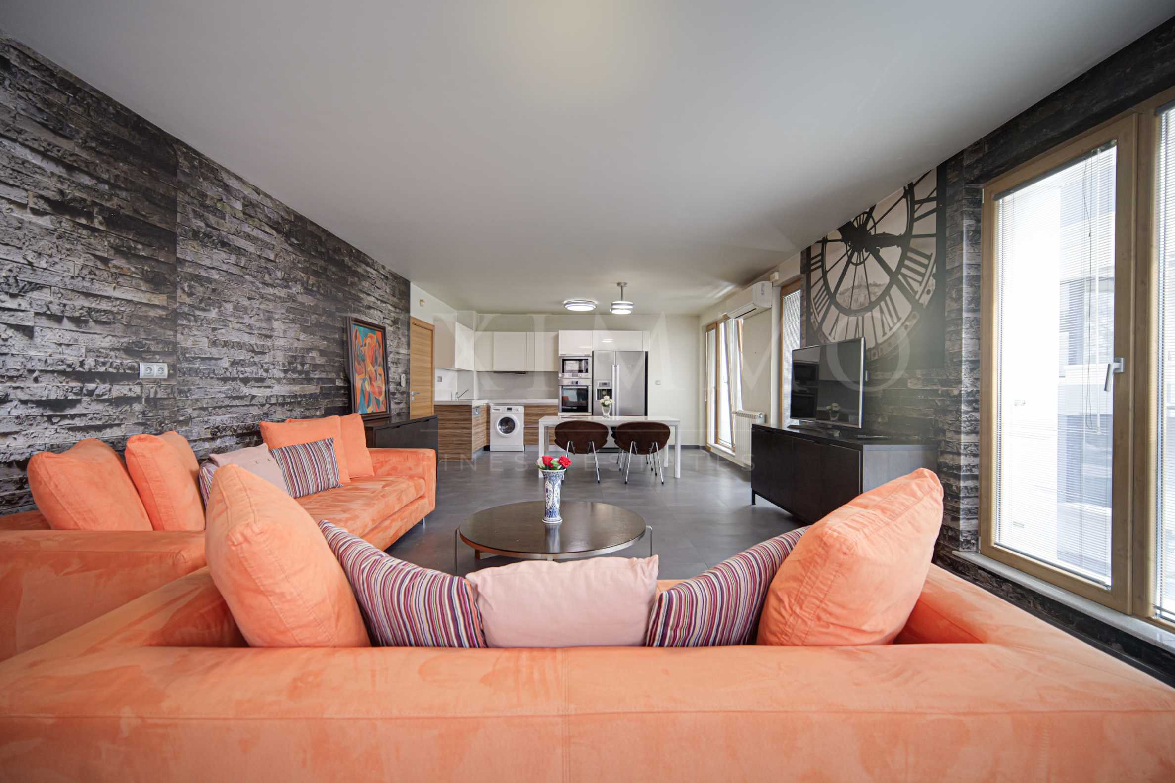 Апартаментът е напълно обзаведен и оборудван в съвременен стил, с дизайнерски мебели и електроуреди и разполага с всичко необходимо за комфорта на бъдещите си наематели.