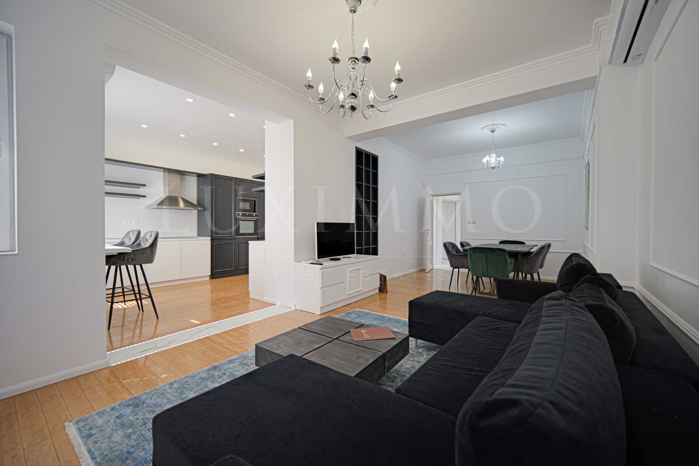 Влизайки в апартамента, се оказвате в просторна и светла дневна с естествен паркет, която е идеално място за семейни събирания или за почивка след работен ден. Непрекъснатият поток на естествена светлина през големите прозорци прави вътрешното пространство по-отворено и приятно за престой. Имотът разполага с просторна кухня, оборудвана с най-новите модерни електроуреди на SMEG. Тук можете да използвате вашите готварски умения с наслада, благодарение на високото качество на уредите и функционалността на пространството.