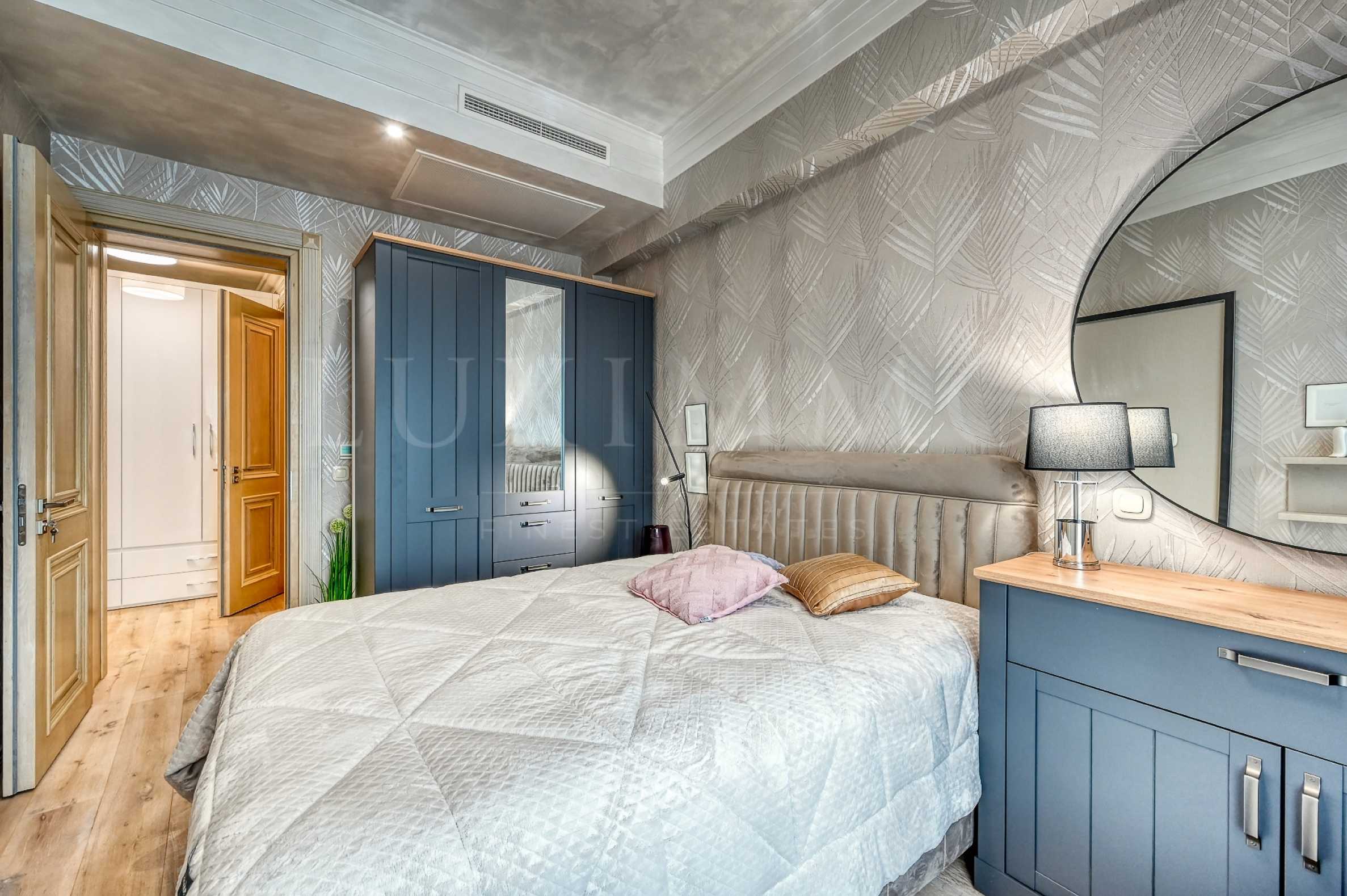Апартаментът е с функционално разпределение включващо просторно антре, светла дневна с кухня и тераса, уютна спалня, детска стая и две бани, тоалетна за гости. Високите тавани, масивните врати с височина 2.40 метра и внимателно подбраните топли цветове създават усещане за комфорт и уют. Жилището е идеално за хора, търсещи комбинация от удобство и елегантност в един от най-престижните квартали на София.