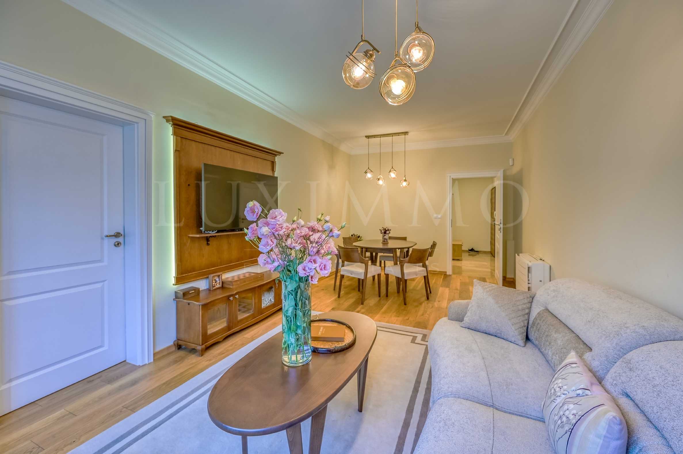 Апартаментът е след основен ремонт и е обзаведен с висококачествени естествени материали. Всеки детайл е внимателно подбран, за да създаде усещане за лукс и уют. Модерното обзавеждане и функционалното разпределение осигуряват всичко необходимо за съвременен начин на живот. Класическото и моделното се преплитат хармонично.