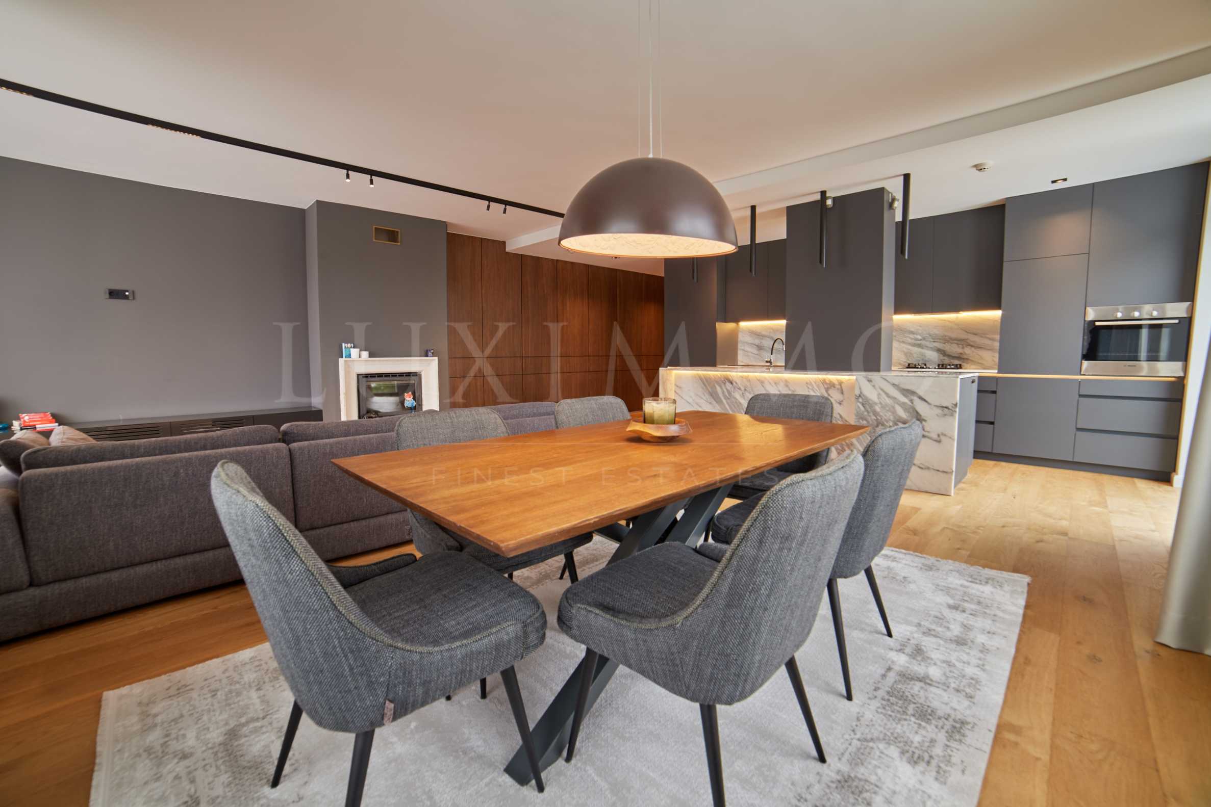 Изключително просторен, с поръчкови мебели по индивидуален дизайн, апартаментът впечатлява с интелигентно разпределение на жилищно пространство, с обмислен до най-малкия детайл, функционален и модерен интериор.