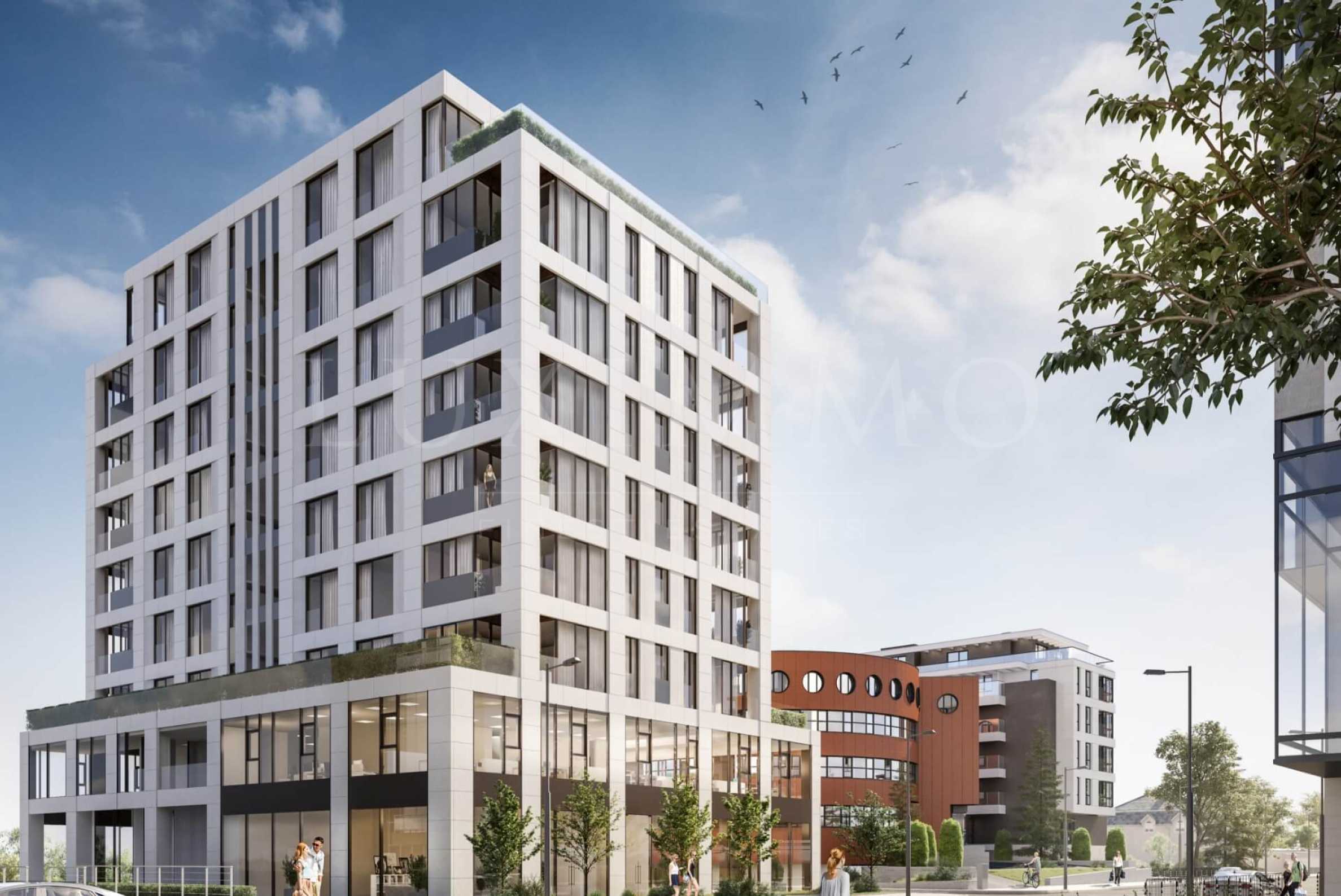 Модерната сградата предлага комфортни жилища на 7 етажа, партер с търговски имоти и два сутерена с 87 бр. паркоместа.