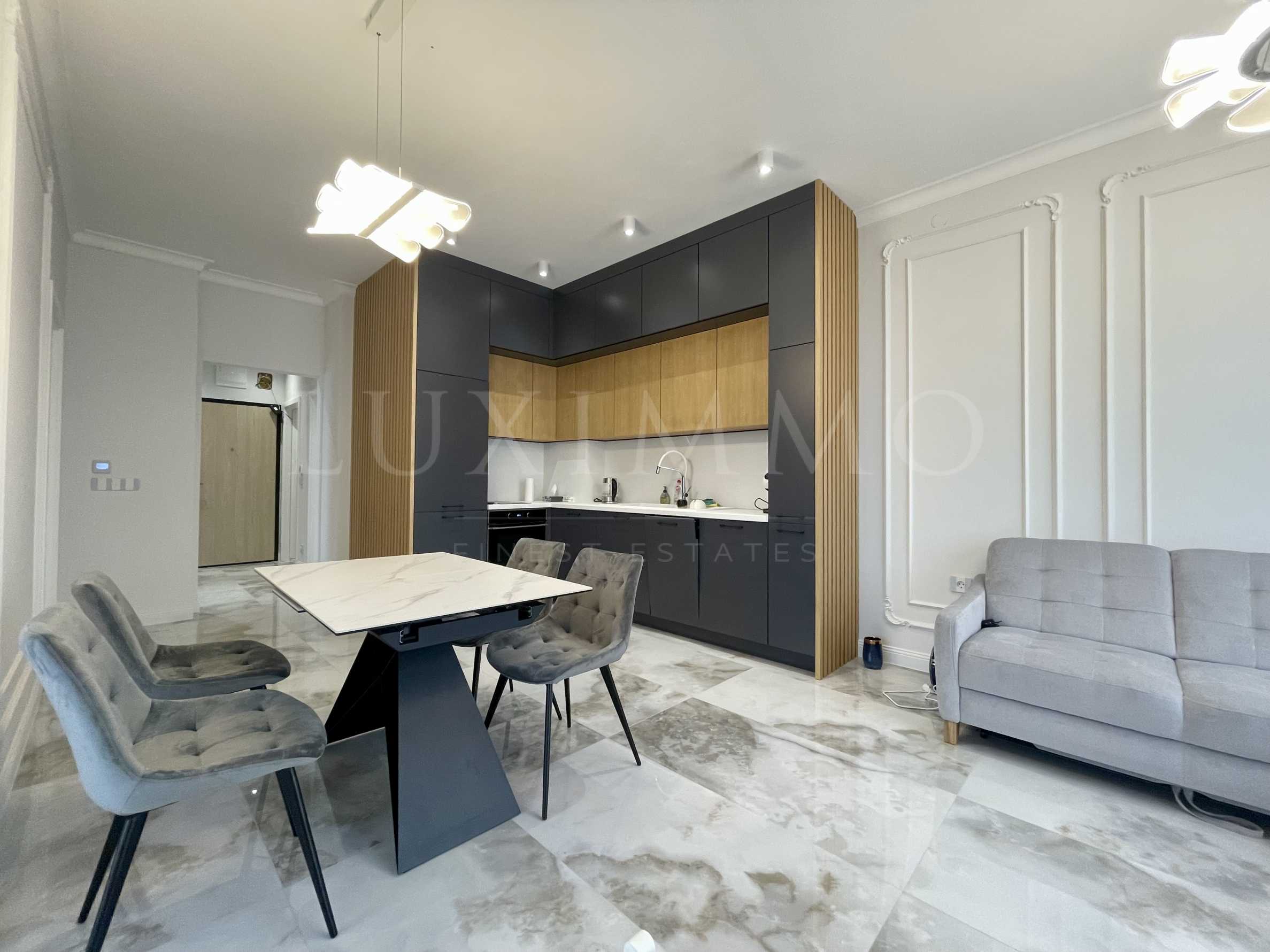 Имотът е луксозно и стилно обзаведен, с висококачествени мебели и уреди, които допълват модерния интериор. Апартаментът предлага всички необходими удобства за един модерен и комфортен начин на живот.