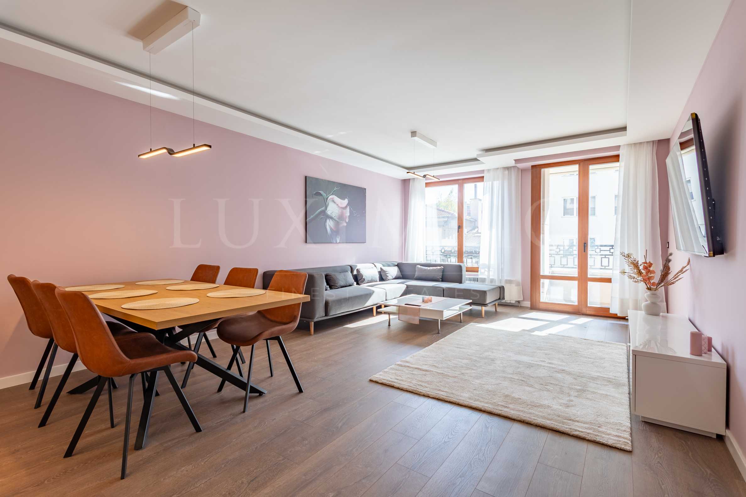 Имотът е с прекрасна слънчева всекидневна с южно изложение, с голям ъглов диван, 52-инчов Smart телевизор, трапезна маса с 6 стола и напълно оборудван кухненски бокс.