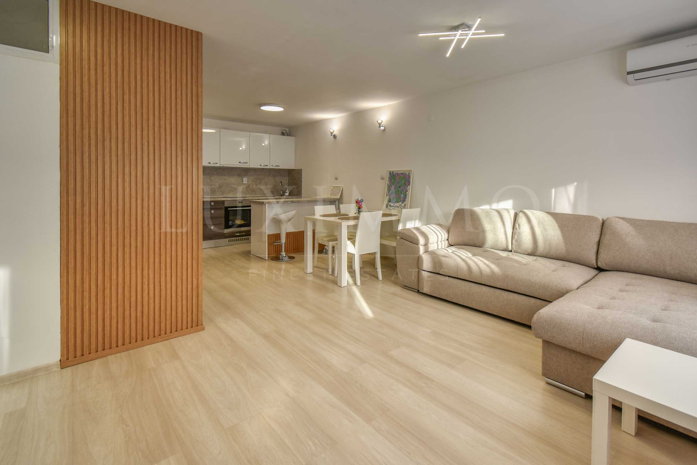 Жилището разполага с голям хол с кухненски бокс (30 кв.м.), две просторни и светли спални с площ от 18 и 14 кв.м., както и изключително удобно антре с гардеробна и портманто. Осигурен е максимален комфорт с една баня с тоалетна и отделна тоалетна – банята е с вана.
