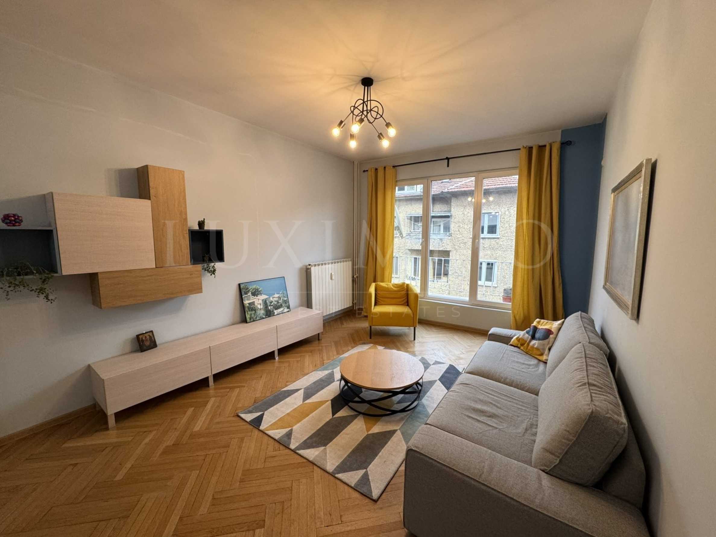 Апартаментът е просторно и светло жилище, което е изцяло реновирано и обзаведено с висококачествени мебели, създавайки перфектната атмосфера за съвременния градски начин на живот. Намира се на четвърти етаж в сграда с асансьор и предлага удобното разпределение на антре, просторна дневна с френски прозорци, които осигуряват естествена светлина през целия ден. Просторната трапезария с кухненски бокс предоставя идеални условия за събирания с близки и приятели, докато двете спални, разположени към тих вътрешен двор, гарантират пълно спокойствие през нощта. Имотът разполага и с две модерни бани, което е допълнителен плюс за удобството на наемателите.