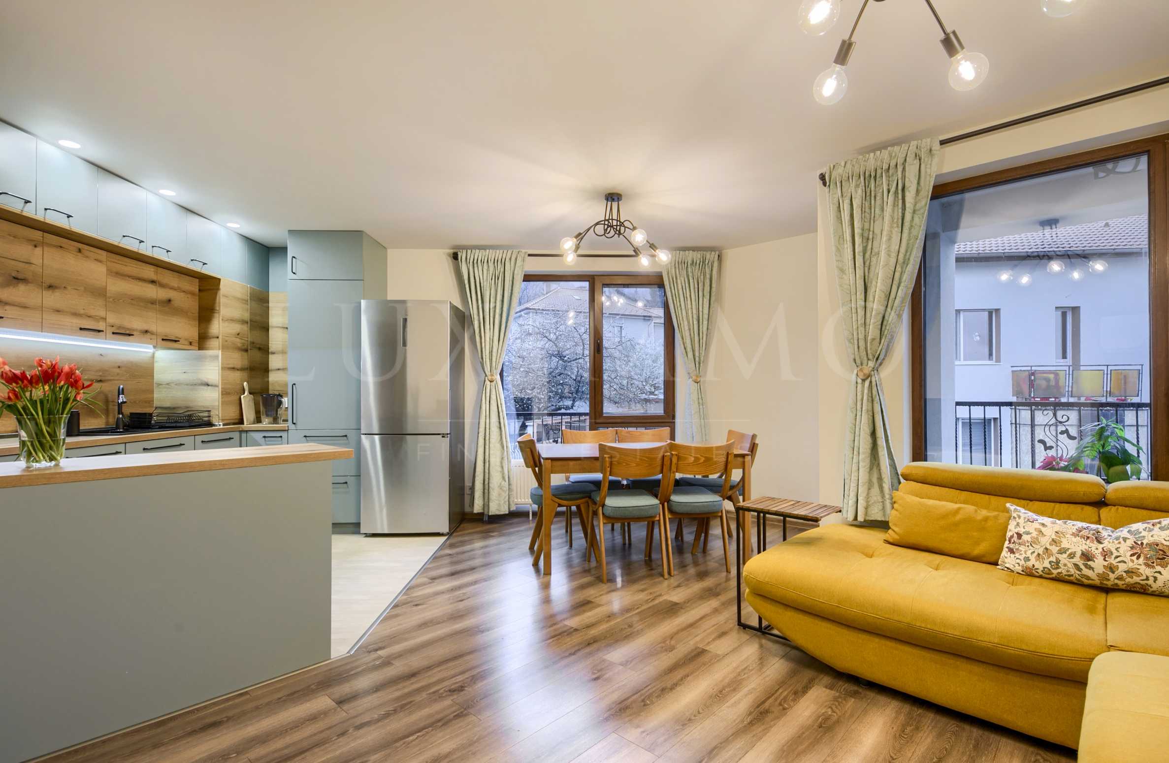 Предлагаме за продажба обзаведен тристаен апартамент в нова сграда от 2022 г. Сградата е с контрол на достъп, видеонаблюдение, отлично подържани общи части и дворно място. Локацията на имота е на тихо и спокойно място, същевременно комуникативно. В района са на разположение спирки на автобуси, детски градини, училища, хипермаркети, малки магазини, заведения, медицински центрове, спортни центрове и други.