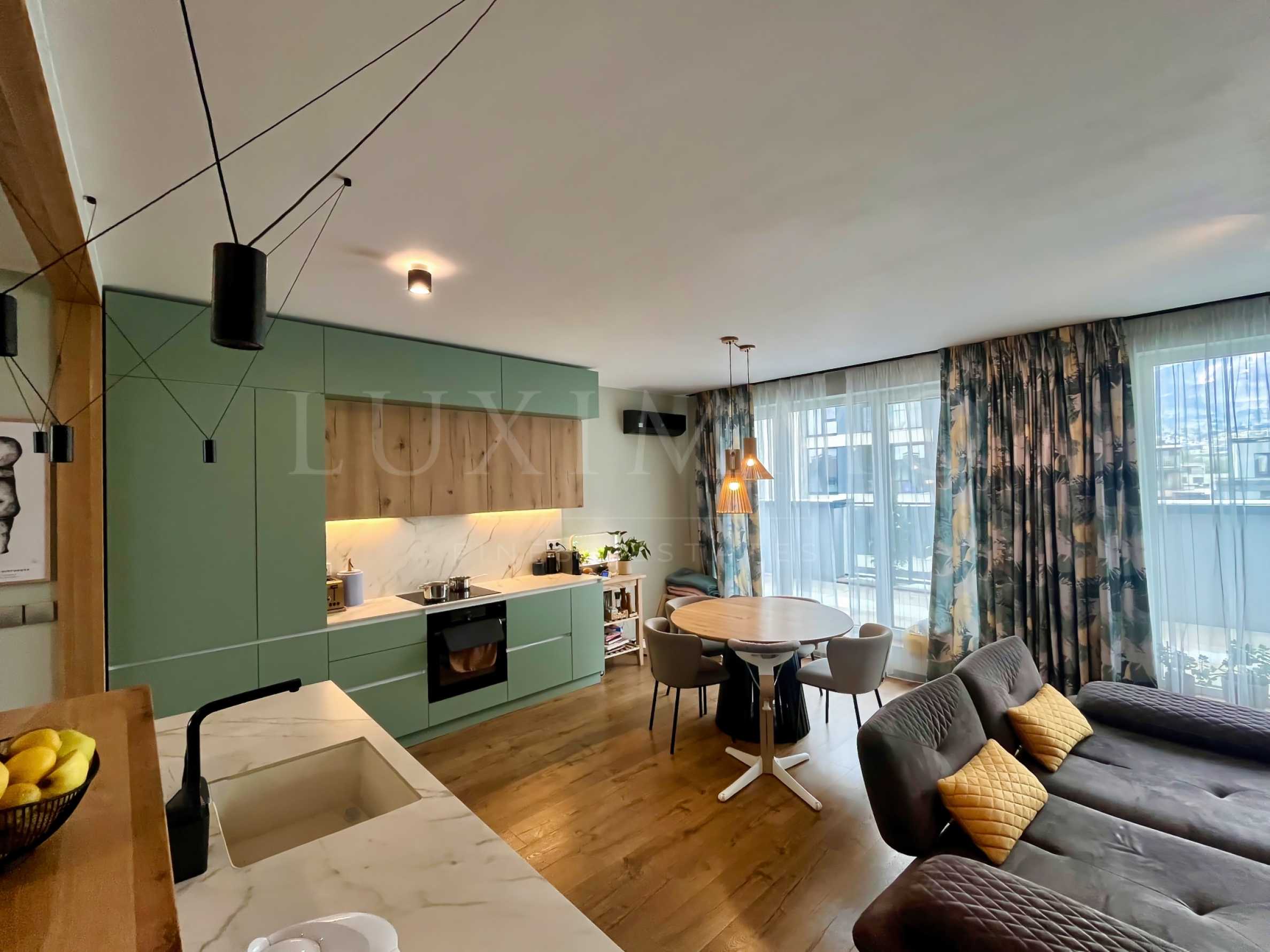 Представяме луксозно обзаведен тристаен апартамент под наем с красиви панорамни гледки, в една от най-елитните сгради, ситуирани в тих, зелен и отлично развит квартал на столицата - "Витоша".