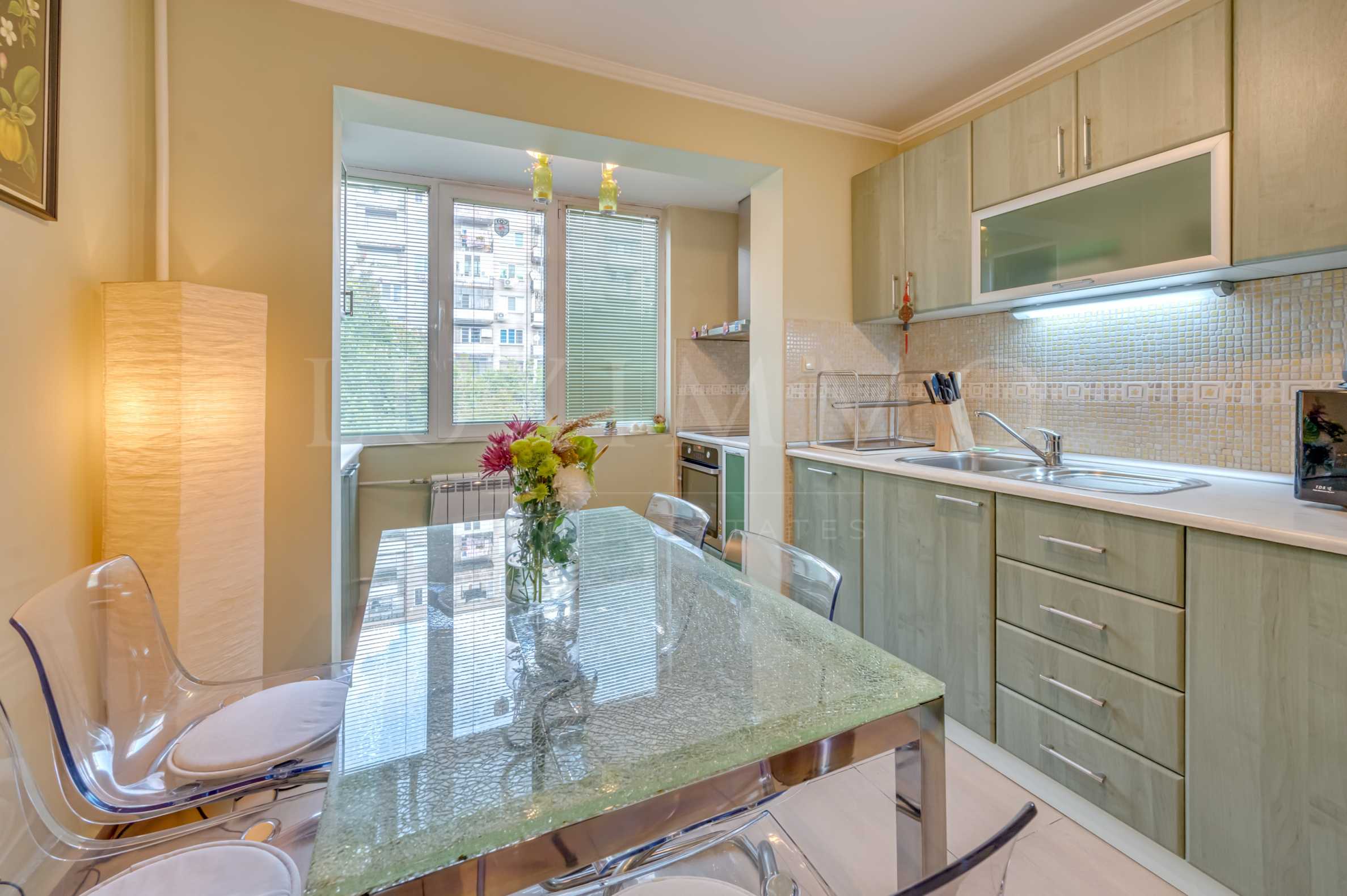 Имотът се намира на тиха и зелена улица, с отлична комуникация и лесен достъп до центъра на града. Апартаментът е напълно обзаведен и оборудван, готов за нанасяне веднага.