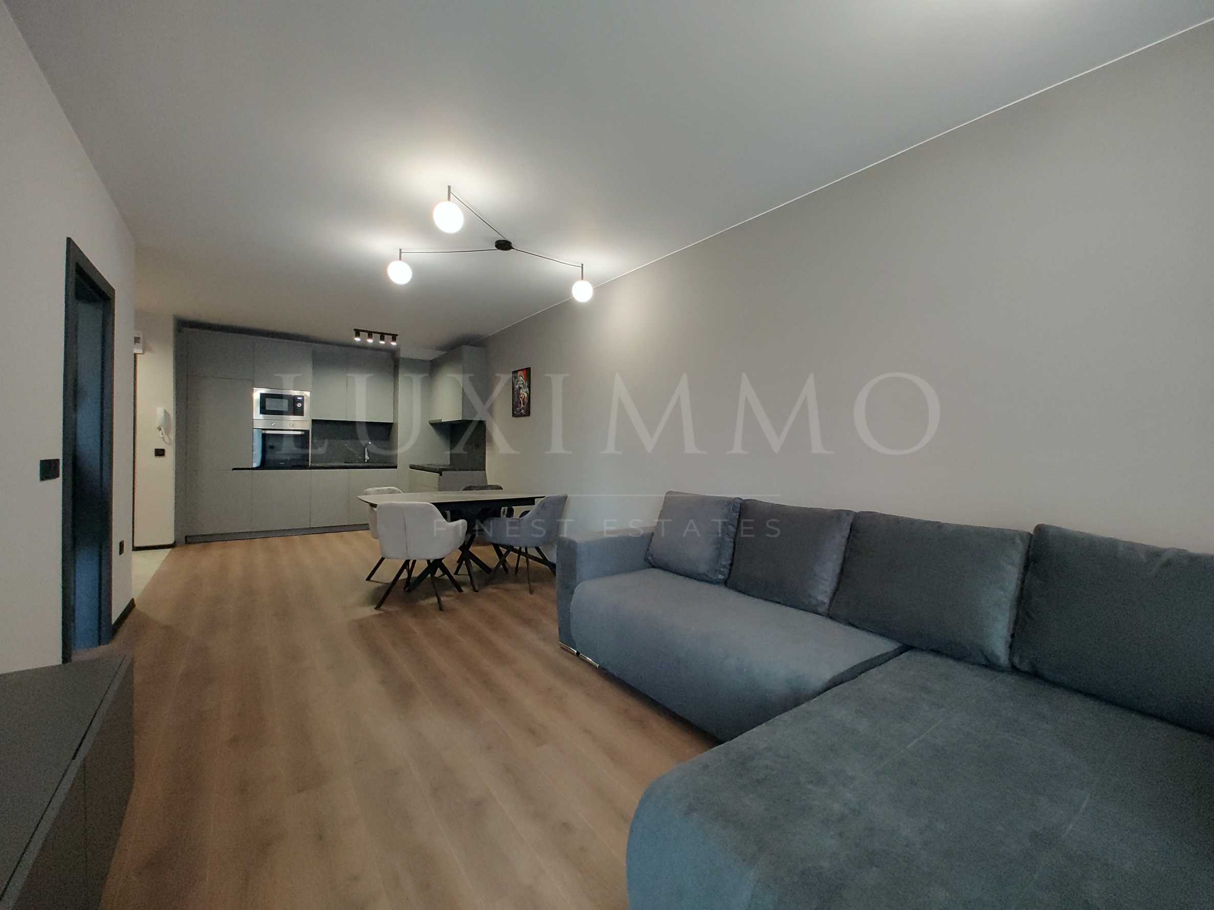 Апартаментът е чисто нов, луксозно обзаведен с висококачествени мебели и електроуреди от водещи марки. Интериорът е решен в съвременен стил, с внимание към детайла, създаващ усещане за комфорт и елегантност. Пространството е изключително светло и приветливо, благодарение на големите прозорци и южното изложение.
