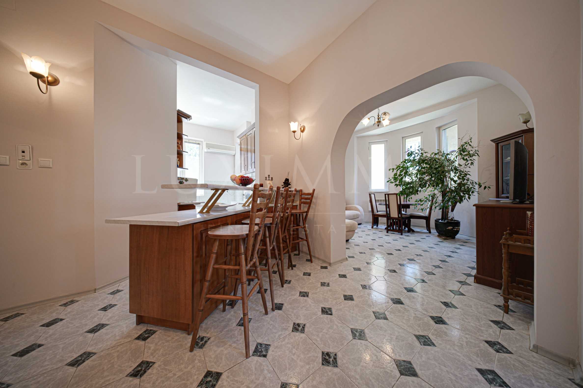 Апартаментът е напълно мебелиран и е част от масивна сграда с дебели стени и високи тавани.