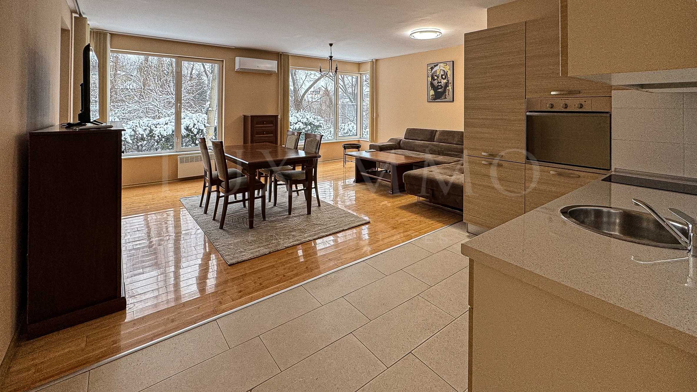Настилките са изпълнени от гранитогрес и паркет, а кухненският бокс е напълно оборудван с всички необходими електроуреди.
