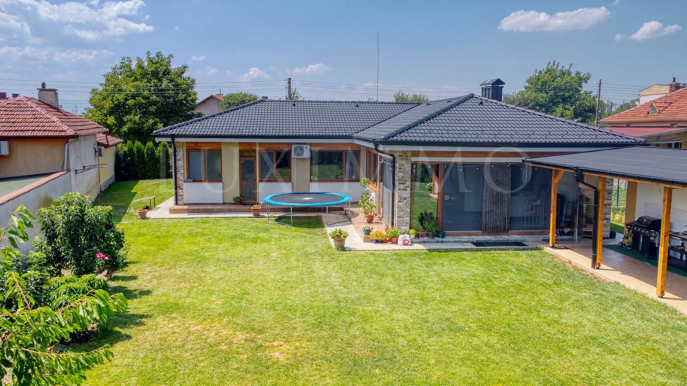 Къщата разполага с площ от 258 кв.м., разделена на просторна дневна с трапезария и кухня с остров, свързана с остъклена веранда и втора кухня. Верандата гледа към красиво поддържан двор с автоматично напояване и барбекю зона под масивен навес с площ от 30 кв.м. Имотът предлага три големи спални, като основната е с дрешник и самостоятелна баня. На разположение са втора баня, мокро помещение, техническо помещение и склад. Имотът е идеален за семейства, които търсят простор и уют в спокойна обстановка близо до столицата.