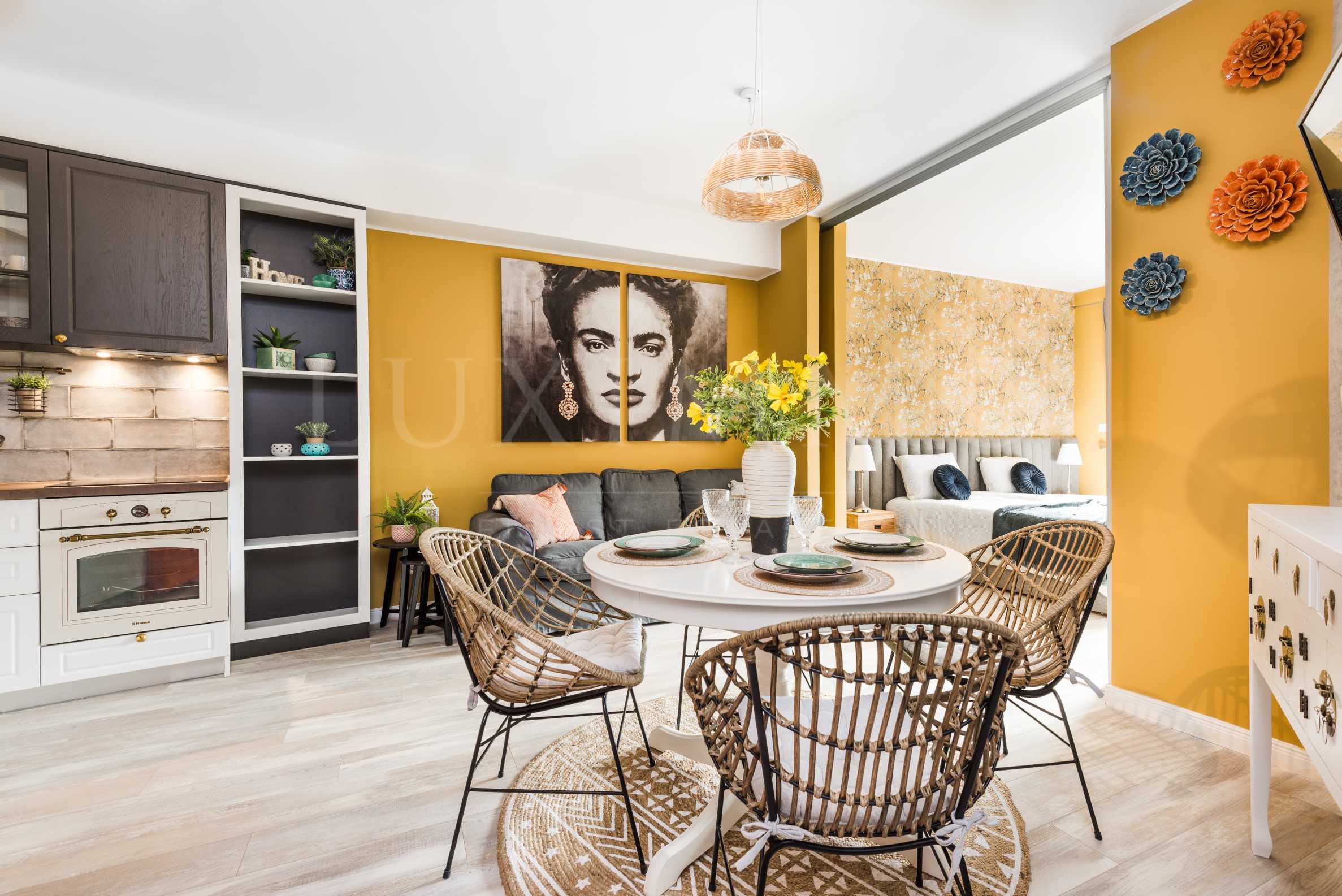 Ярък и стилен, апартаментът е обзаведен с висок клас актуални мебели, със стенни покрития и уреди по дизайнерски проект и е подходящ както за живеене, така и за отдаване под наем.