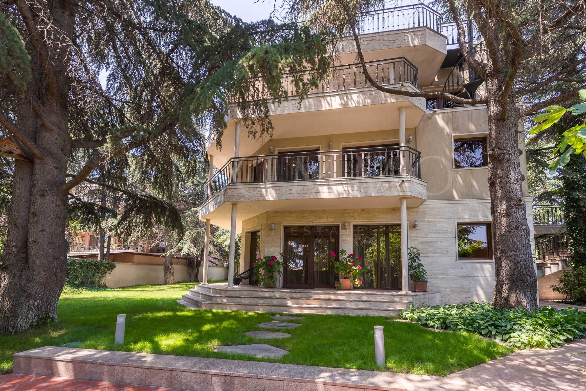 Парцелът с площ от 1 382 кв.м е като лична ботаническа градина – озеленен с изящество, осеян с вечнозелени иглолистни дървета и поддържан чрез автоматична поливна система. В двора ще откриете и напълно оборудвана зимна градина с барбекю зона, санитарен възел и уют под навеса – идеалното място за семейни тържества или вечери с приятели.