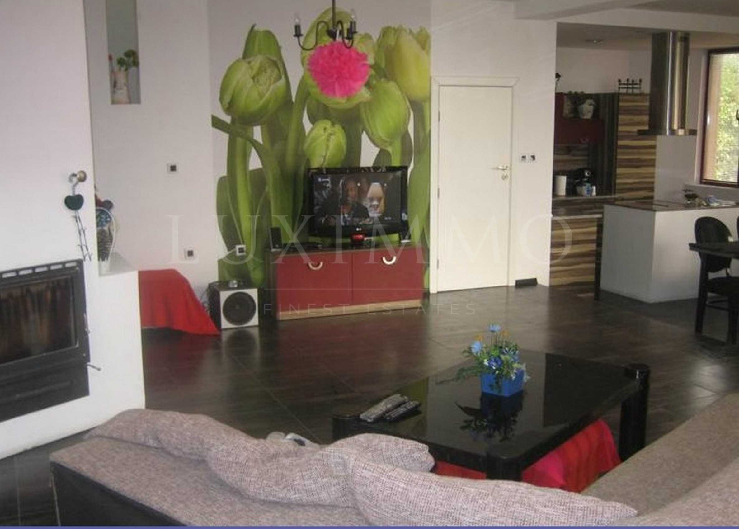 Къщата се състои от: първи етаж– спалня, баня с тоалет, дневен тракт на три нива, кухня, килер. На втори етаж: 4 спални, две бани с тоалет. Едната спалня е разположена в емпоре с вътрешна стълба, тоалетна. Къщата се отоплява с две камини с водна риза и радиатори. На първи етаж спалнята е с климатик. Всички спални са с тераси. Барбекю зона на двора и голяма веранда. Масивна ограда с два входа, гараж. Цената е с наличното обзавеждане.