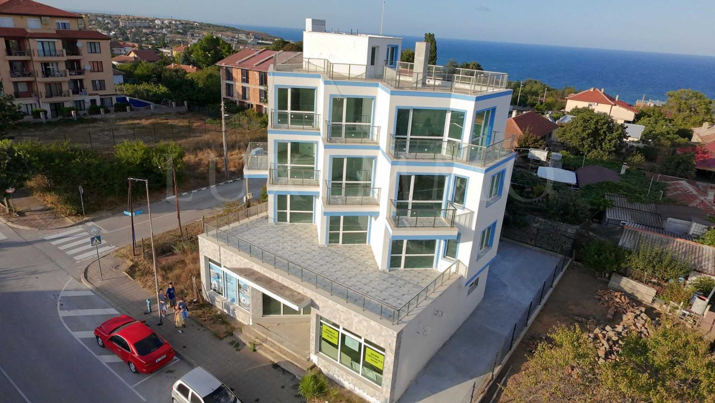 На етаж има по два апартамента и всеки апартамент разполага с килер, тераса и гледка към морето.