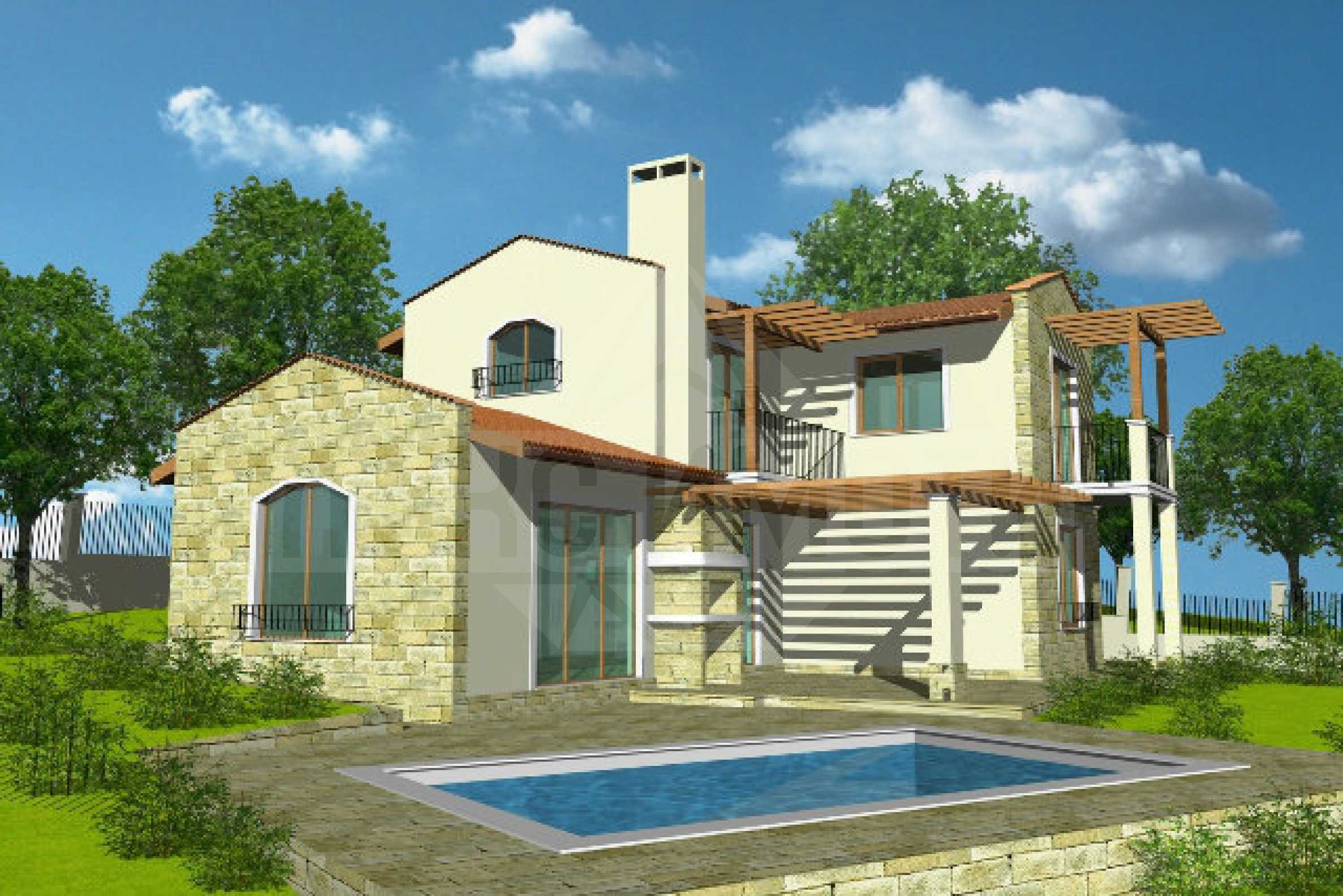 • Акценти във фасадата са каменните облицовки на две от стените дървените перголи над площадката с барбекюто и балкона