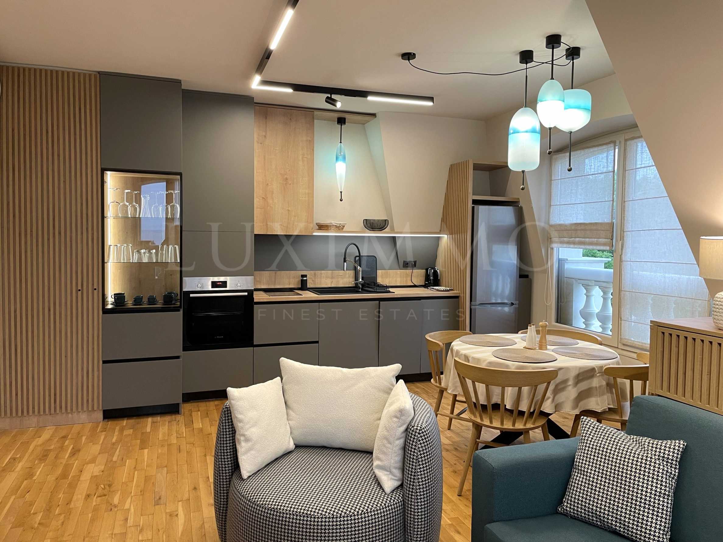 Първокласен двустаен апартамент под наем с просторни помещения, елегантен интериор и гледка към морето.