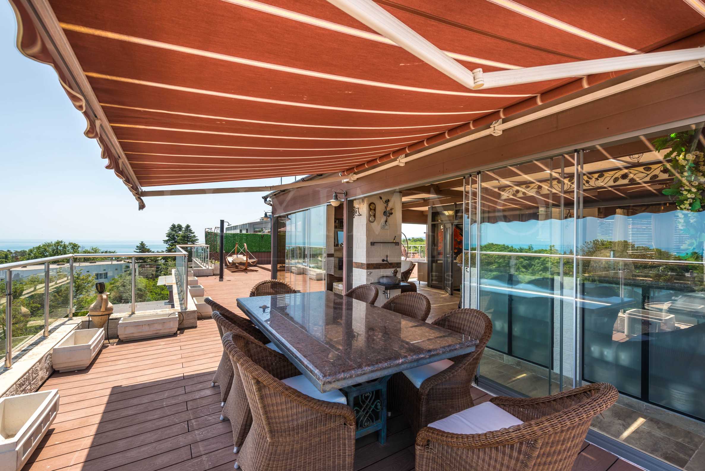 • второ ниво - остъклена зона (70 кв.м) с оборудвана лятна кухня, спалня, тоалетна с умивалник и душ, зона за релакс със система за домашно кино, фонтан, камина с етанол, както и 185 кв.м покривна тераса оборудвана с декинг от композитен материал, шезлонги, цветарници с поливна система, летен душ със слънчева вода, както и осветление и озвучение.