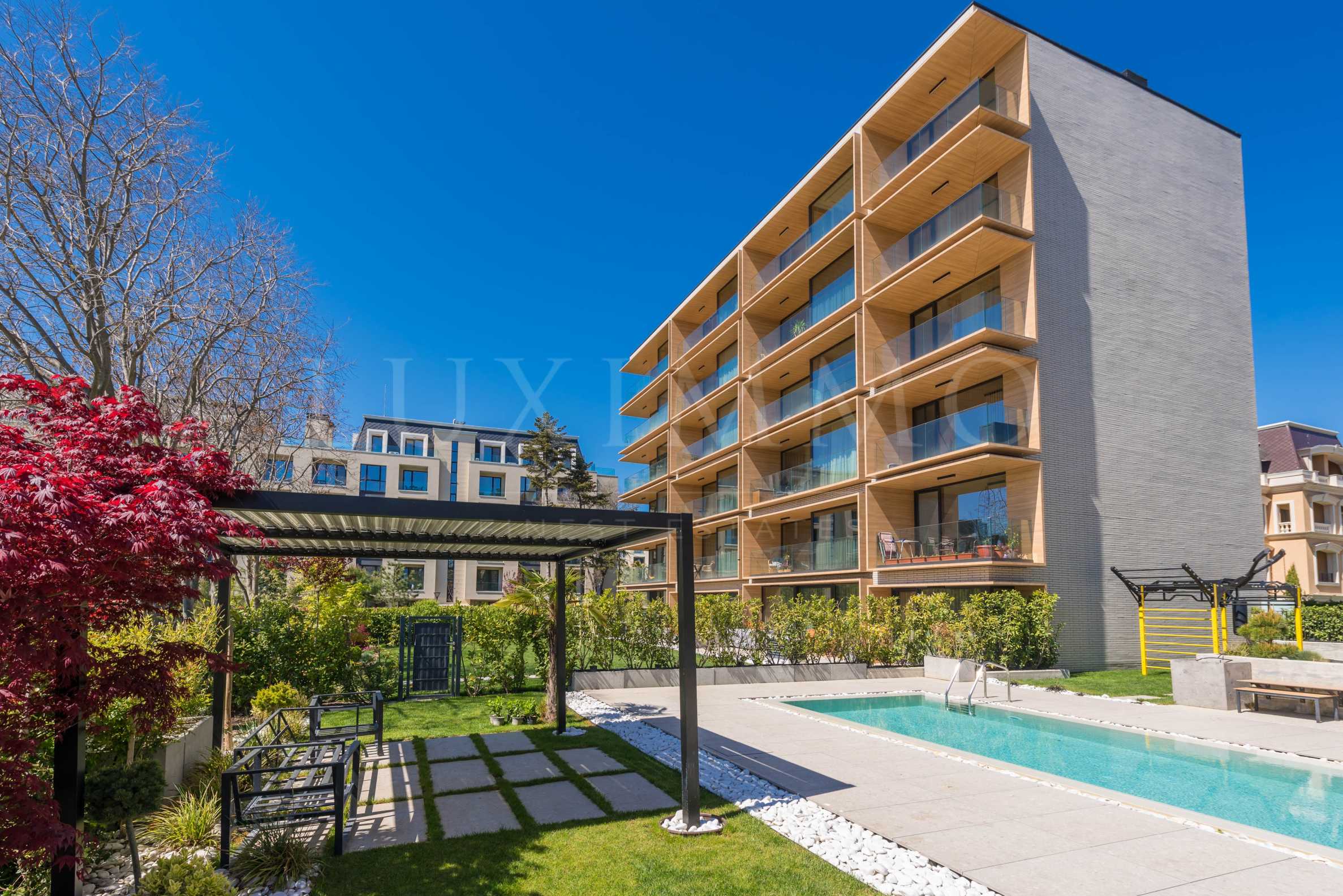 Жилището е качествено завършено с висок клас материали и е оборудвано с модерни и функционални мебели. Вградената кухня е правена по индивидуален проект с висококачествени електроуреди Miele. Оборудвана е с фурна, ширм, съдомиялна и кафе машина, вграден хладилник с фризер, винена витрина и мивка. Подовите настилки в дневната са изпълнени с естествен паркет и италиански гранитогресни плочи в кухненския ъгъл, в спалните с текстилна мека настилка, а на терасите с дъски от композитен материал. Стените са облицовани с фурнирни плоскости с вградено осветление, огледала и стъкла, като в детската спалня са изпълнени с цветни рисунки. Таваните са окачени с монтирано вградено осветление и фоново озвучаване. Повечето помещения са напълно мебелирани, но в дневната можете да изберете меката мебел по Ваш вкус.