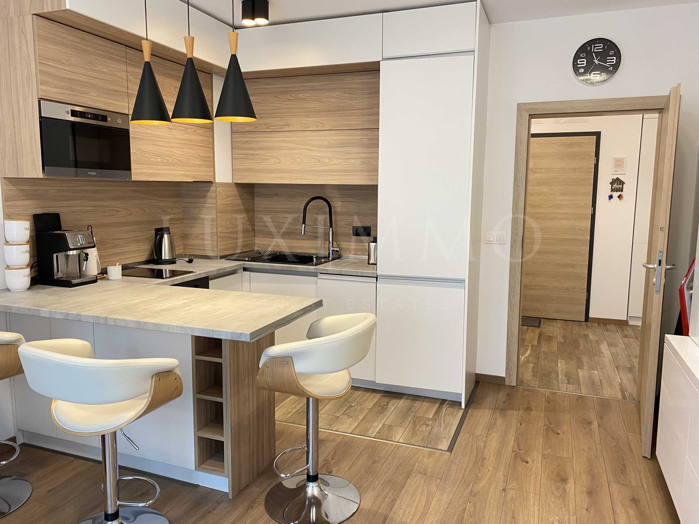 Жилището с обща площ от 80 кв.м е разположено на 1-ви етаж от 6 в нова бутикова сграда с асансьор и има следното разпределение: