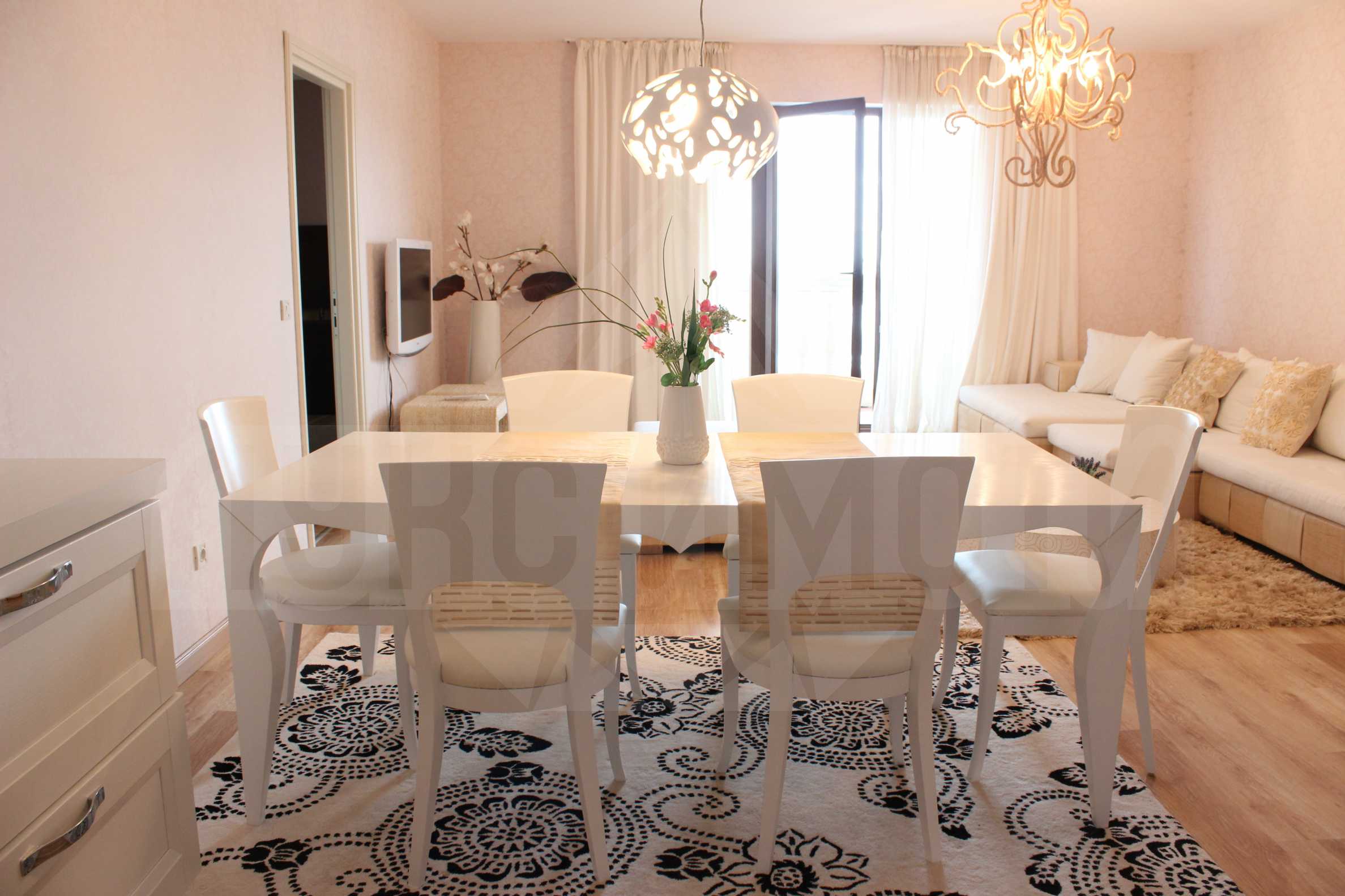 Дневната е условно разделена на три части: кухненски кът, трапезария и хол. Централно място в помещението заема стилна бяла маса и трапезни столове, създаваща чувство на елегантност и изтънченост. Интериорът е решен в меки тонове – преплитащи се в бледорозово, бежово и жълта охра. Естествените ленени материи, използвани в къта с мека мебел допълват хармонията и изразителния дух на жилището. Всички стени са покрити със специални италиански тапети.