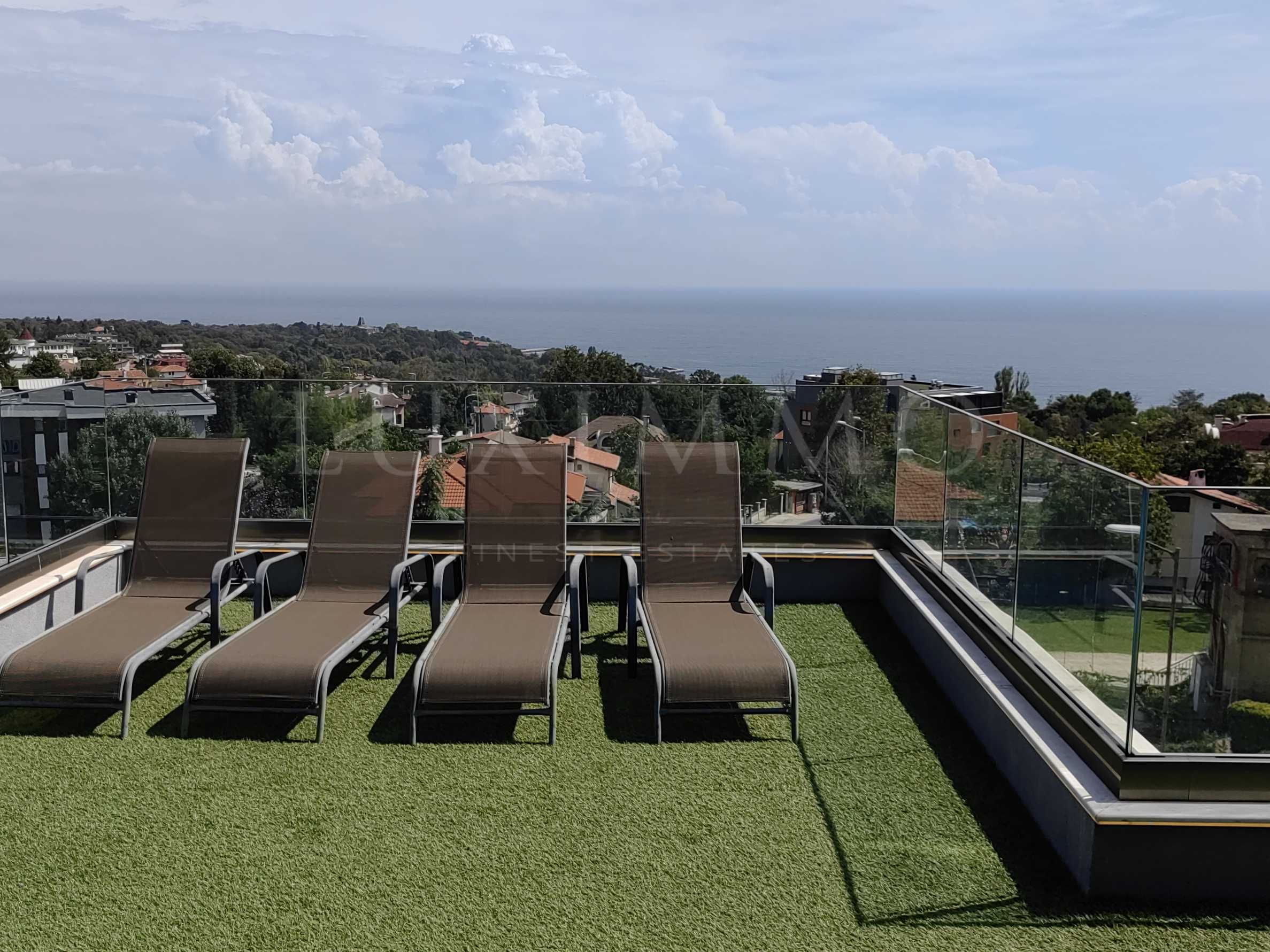 Имотът е разположен на югоизточен склон, и от него се открива обширна фронтална морска панорама. Апартаментът се намира на последния етаж и е разпределен на две нива, като всяко е с квадратура от 170 кв.м.