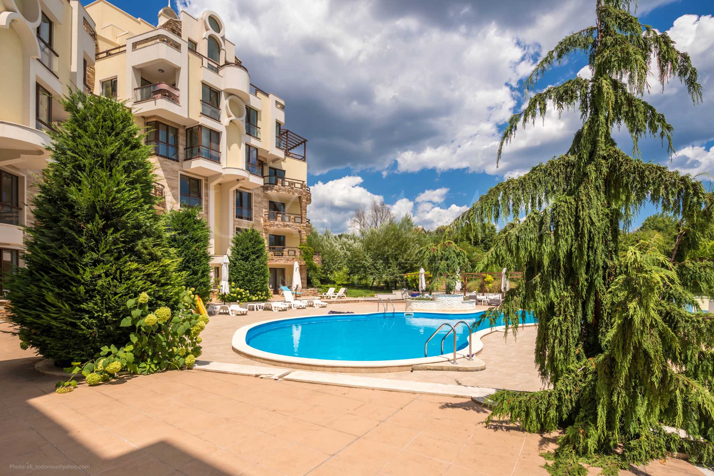 Апартаментът се намира на партерен етаж с изглед към басейна.