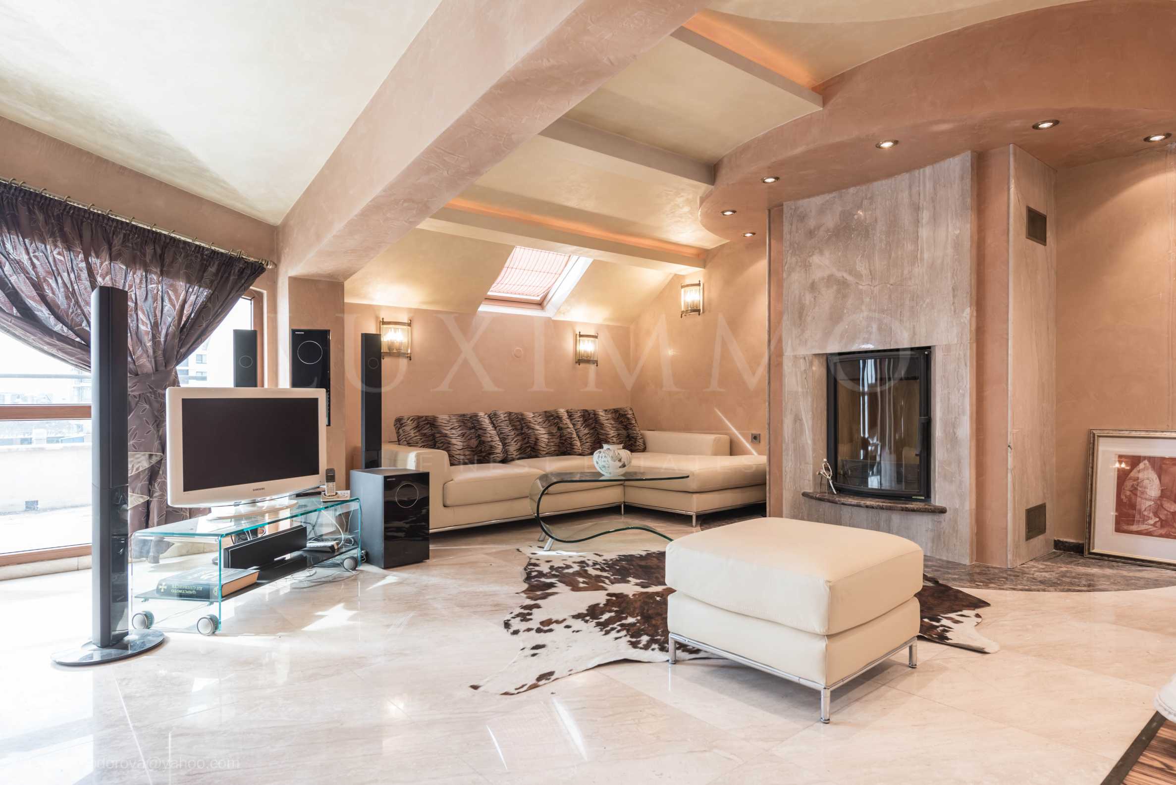 Имотът е разположен на 6-и, последен етаж в сграда от 2007 г. Модерната сграда е с луксозни общи части и модерен асансьор Multilift, първокласно строителство: стени, под и стъпала от полиран камък, парапети - месинг, покрив от мед.